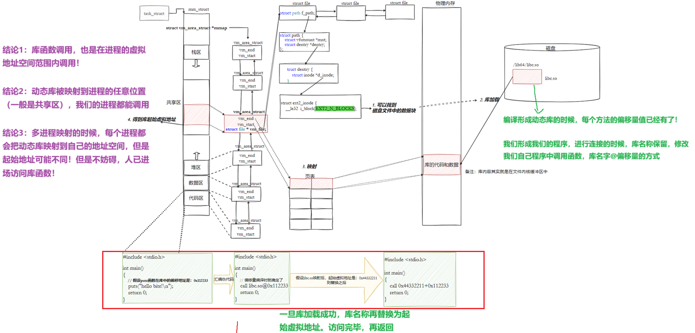 结论四 : 每一个进程把要的库映射到自己的虚拟地址空间中,即多个进程能看到同一个库.这种方式不需要重复加载代码和数据在物理内存中,有效节省内存空间.