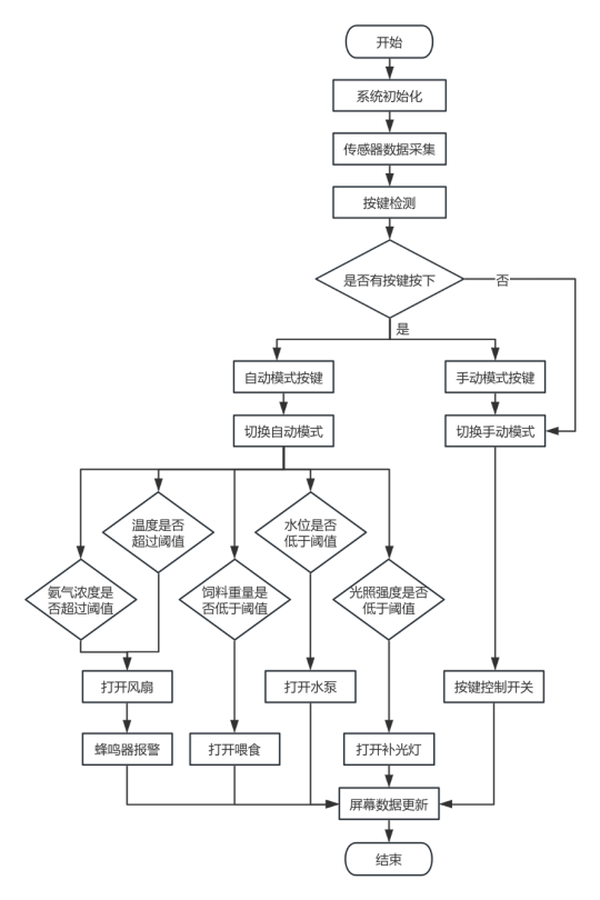 - 自动模式: 检测到光照强度低于阈值,自动打开补光灯; 检测到水位低于阈值,自动打开水泵;检测到氨气浓度或温度超过阈值,打开风扇通风,并蜂鸣器报警;检测到饲料重量低于阈值,自动打开步进电机喂食。