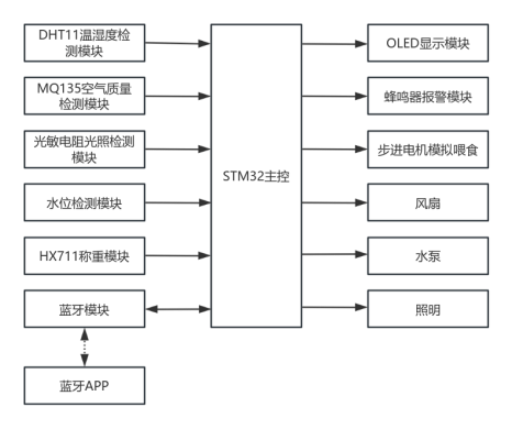 - 执行机构:控制风扇、水泵、LED灯、步进电机(喂食)。