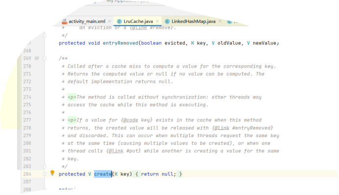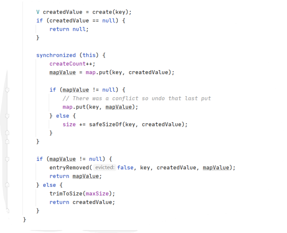根据key值返回缓存的value值(如果没缓存,调用create方法创建对象),缓存对象返回后,该缓存对象将被移动到队列头部。 如果缓存没命中,但是对象创建非空,会把创建的对象存入缓存,总缓存大小size加上新创建的对象大小。