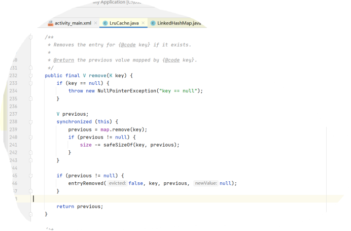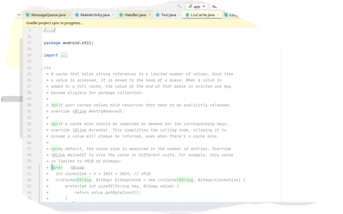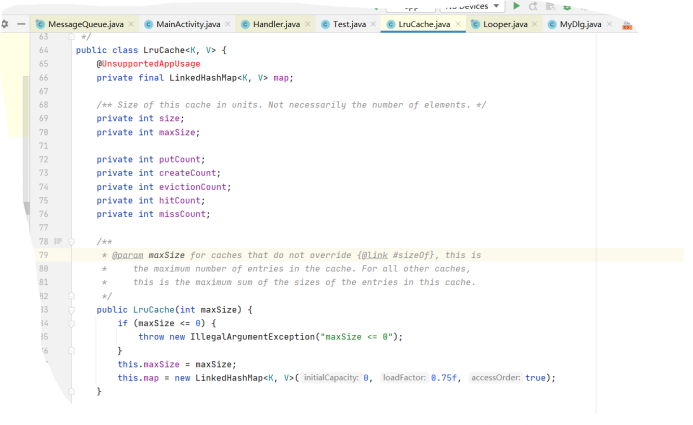 意思是,这是一个缓存工具类,对有限的缓存对象持有强引用。当一个缓存对象被访问,该缓存对象会被移动到一个队列的头部。当缓存已满时添加一个对象,队列尾部的对象将被移除,并可能被垃圾回收。