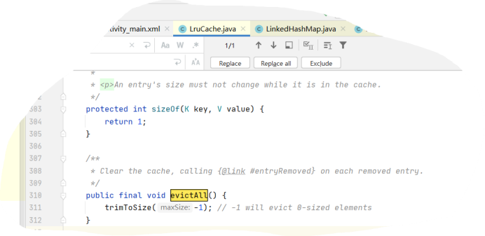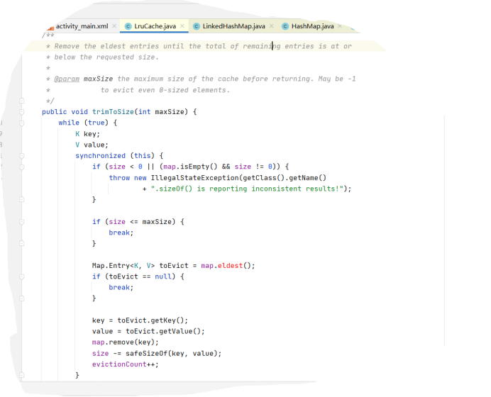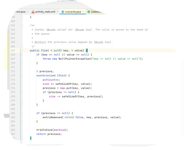缓存该对象,计算最新缓存大小size的值。再调用trimToSize方法清除旧缓存,然后返回该key值对应的前一个value值。添加的value会被移动到队列头部。