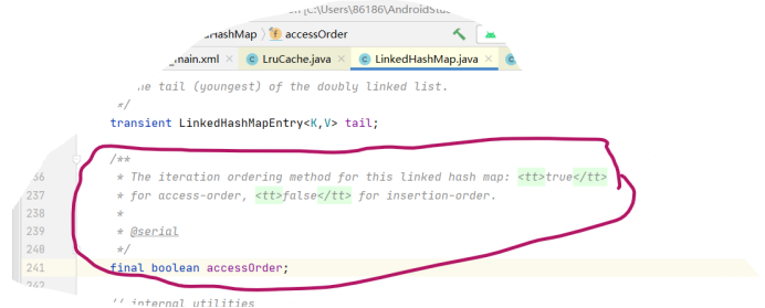 传入maxSize为最大缓存大小,默认为存入的缓存的键值对数量。this.map = new LinkedHashMap<K, V>(0, 0.75f, true); 这句代码实例化map用于存放缓存对象。看下第3个参数accessOrder的意思,代码在LinkedHashMap中,如下,意思是遍历该map的顺序,值为true则为访问顺序,false为插入顺序。