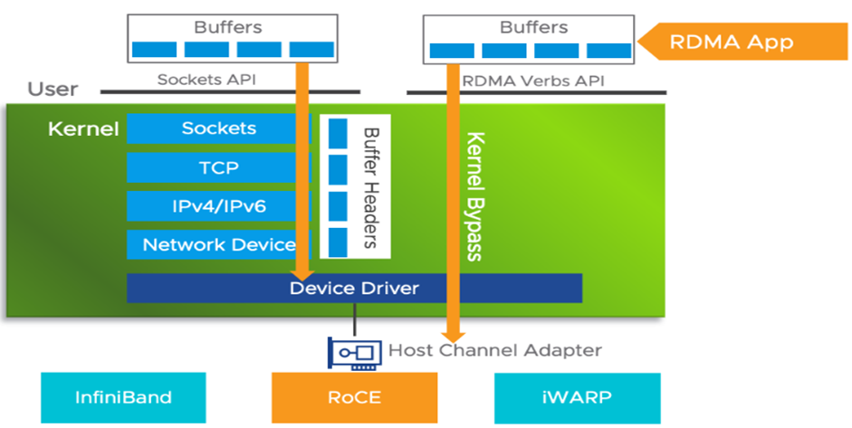 - iWARP:允许在TCP上执行RDMA的网络协议,同样兼容以太网,但需将整个TCP/IP协议栈卸载到硬件,存在成本、实现复杂度、性能方面的限制。