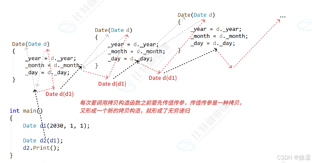 ②拷贝构造的第一个参数必须是当前类类型的引用,使用传值方式编译器直接报错,因为语 法逻辑上会引发无穷递归调用。拷贝构造函数也可以多个参数,但是第一个参数必须是类