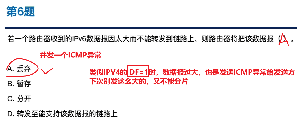 - 相当于IPV4的DF=1,如果数据报过长就丢弃、并发ICMP异常