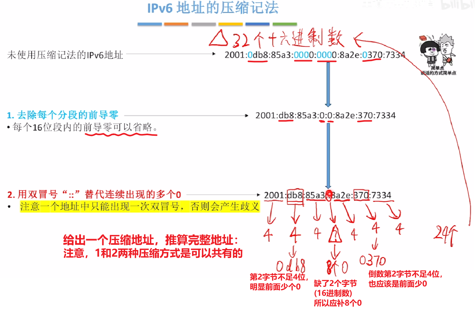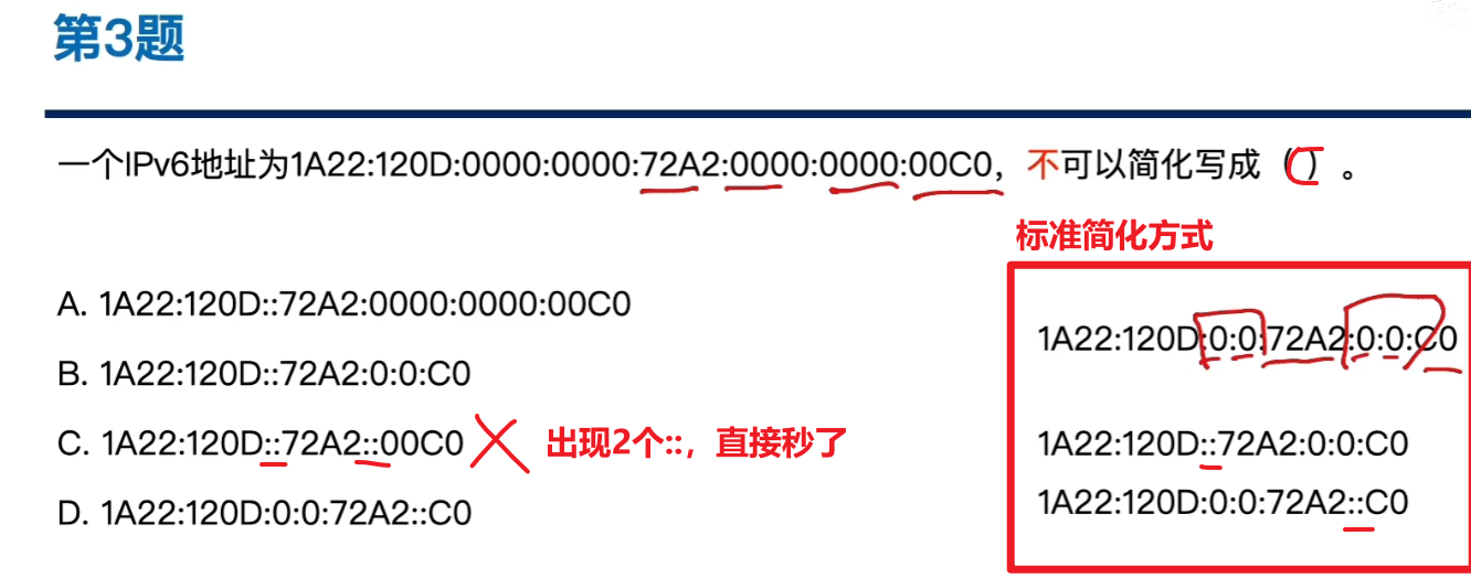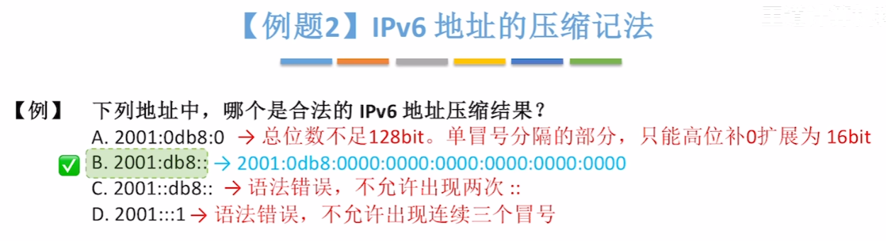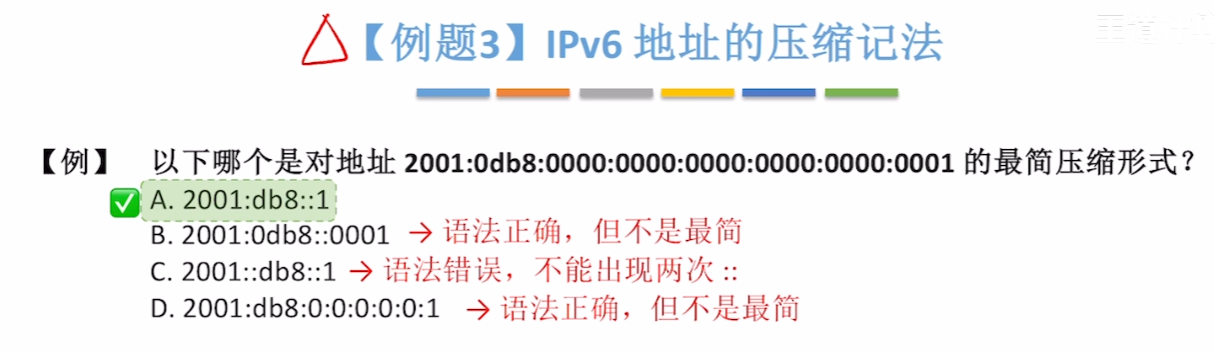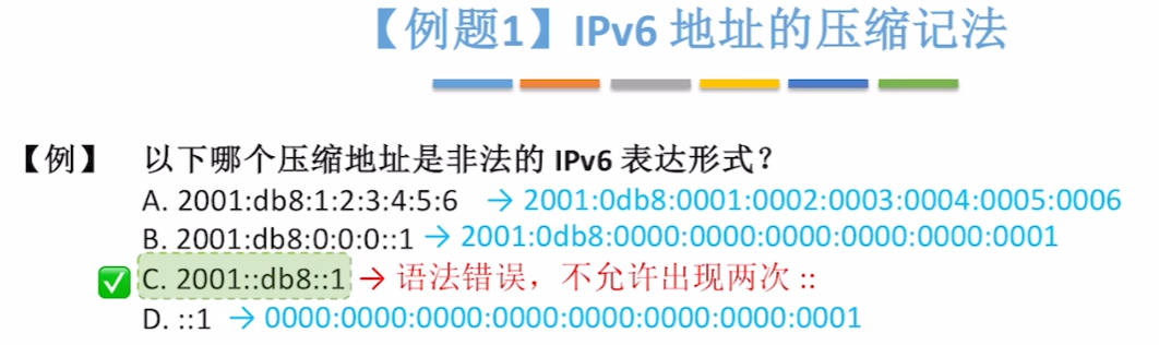 即便二进制位全压缩成十六进制,8个字节(32个)十六进制数也还是太长了,于是还有下面几种压缩表示法(就是【省略每个字节过多的0】)