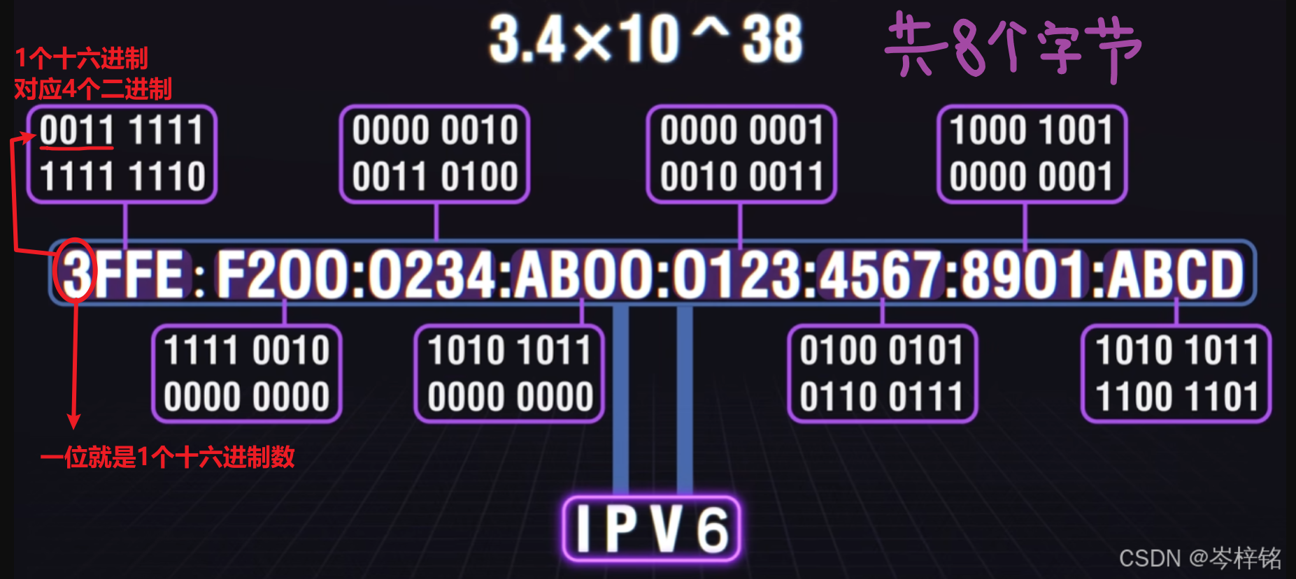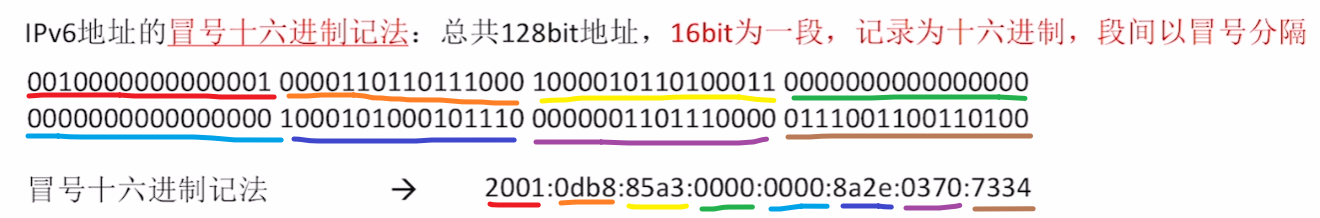 【IPV6】是一个【16字节 的 十六进制】地址,中间用冒号 “:” 隔开,每一字节为16bit,总共128bit