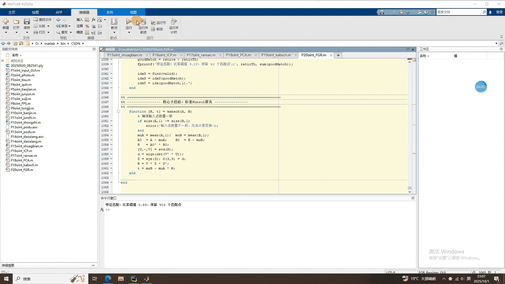 %% =========================================================================function [R, t] = kabsch(A, B)% 确保输入点数量一致if size(A,1) ~= size(B,1)error('输入点数量不一致,无法计算变换');endmuA = mean(A,1); muB = mean(B,1);A0 = A - muA; B0 = B - muB;H = A0' * B0;[U,~,V] = svd(H);d = sign(det(V' * U));S = eye(3); S(3,3) = d;R = V * S * U';t = muB - muA * R;endend