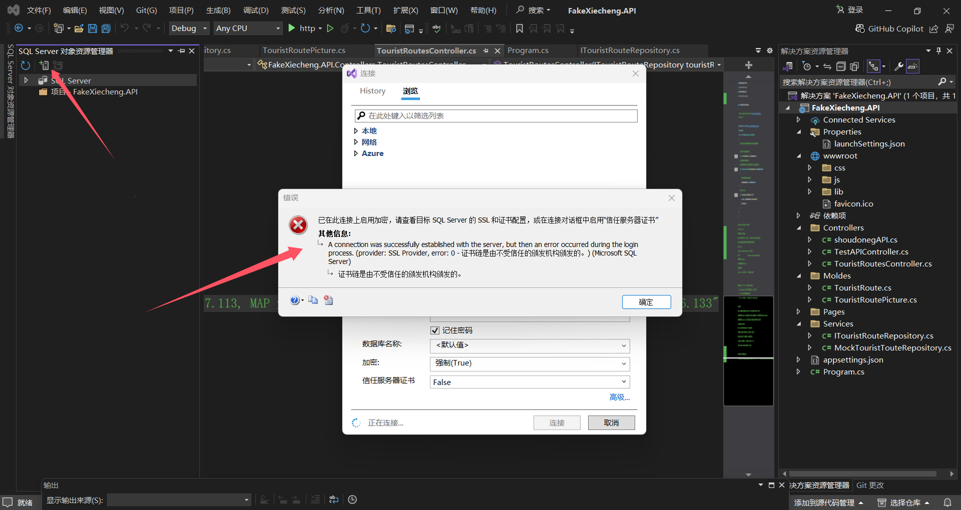 在 SQL Server 连接对话框中,找到 “信任服务器证书” 选项,将其从 False