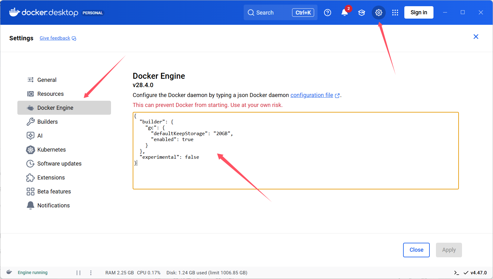 (应用并重启)按钮 ,Docker Desktop 会保存配置并重启 Docker 服务,DaoCloud 镜像加速配置就会生效。验证配置是否成功
