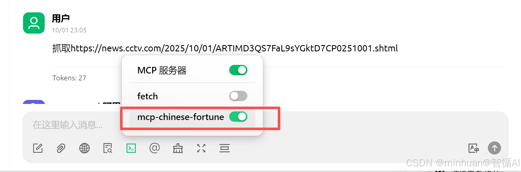 在聊天窗口选择启用“mcp-chinese-fortune”的MCP服务