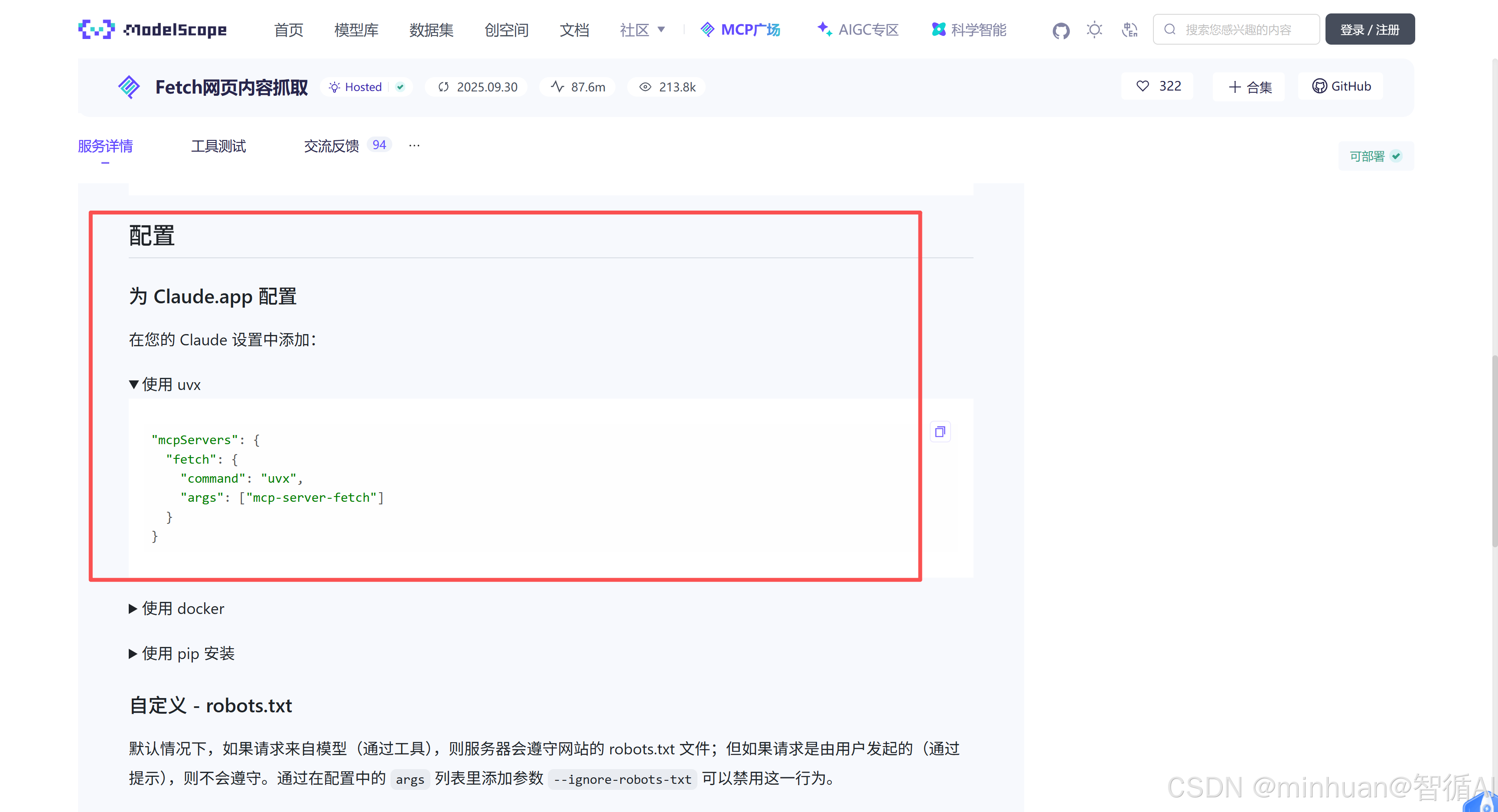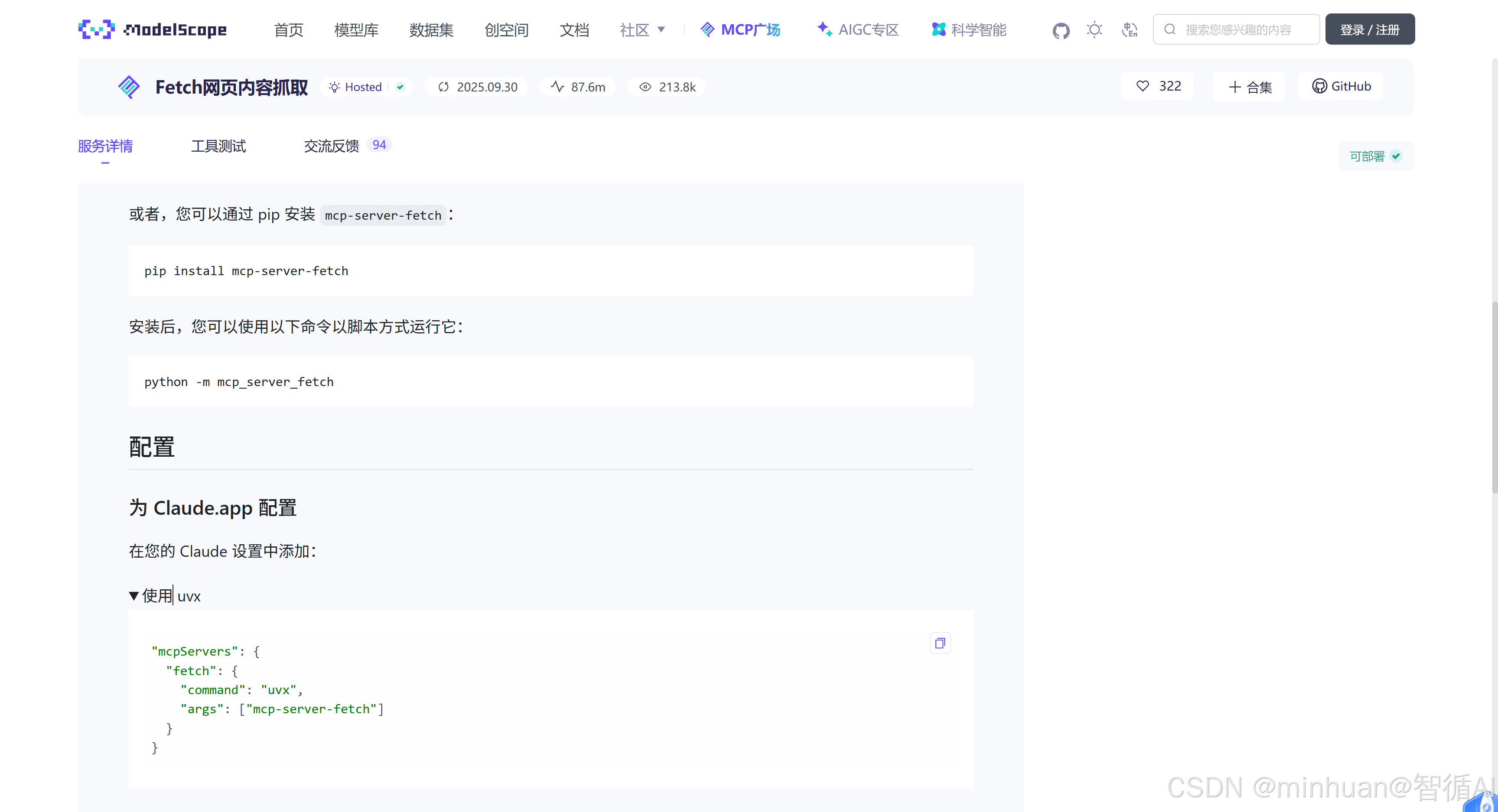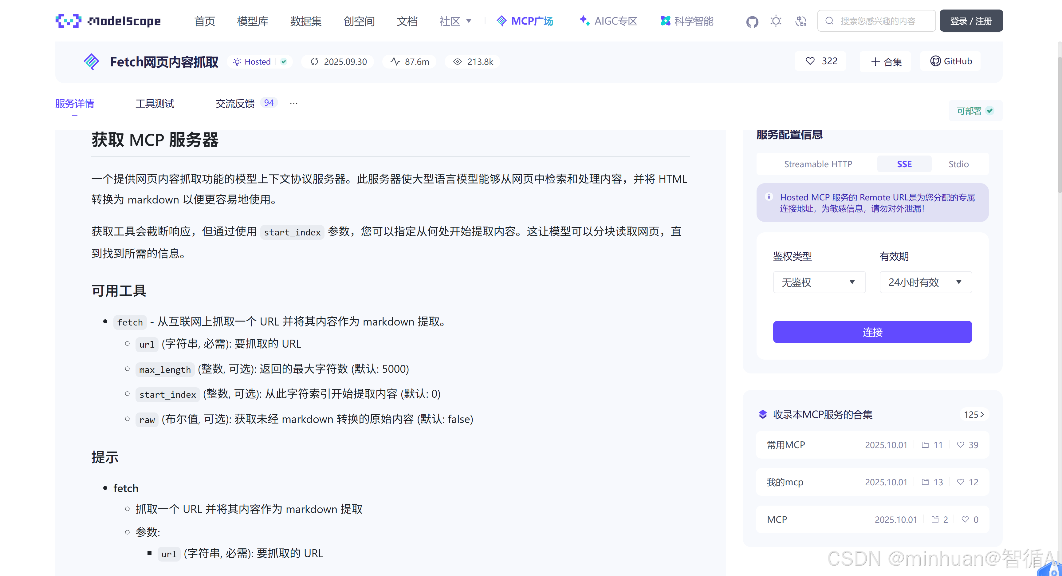 首先我们可以在ModelScope的MCP广场找一个现成的MCP服务,以Fetch网页内容抓取网页抓取为例,先看MCP的详细介绍: