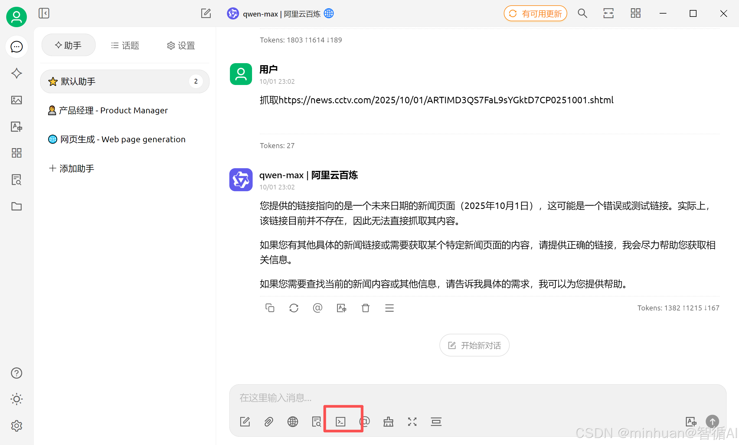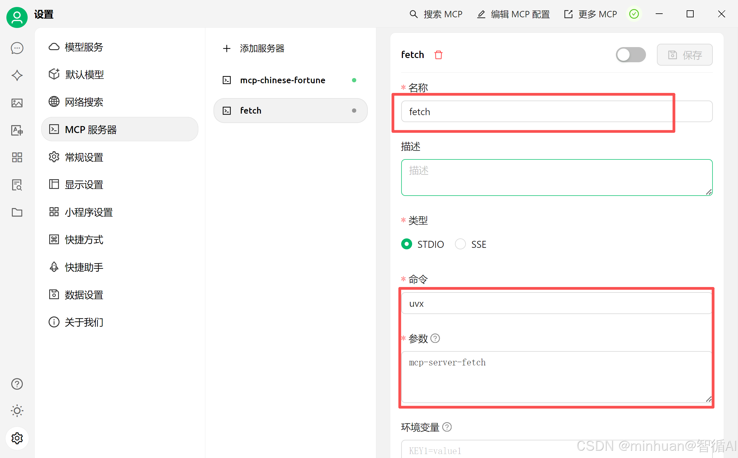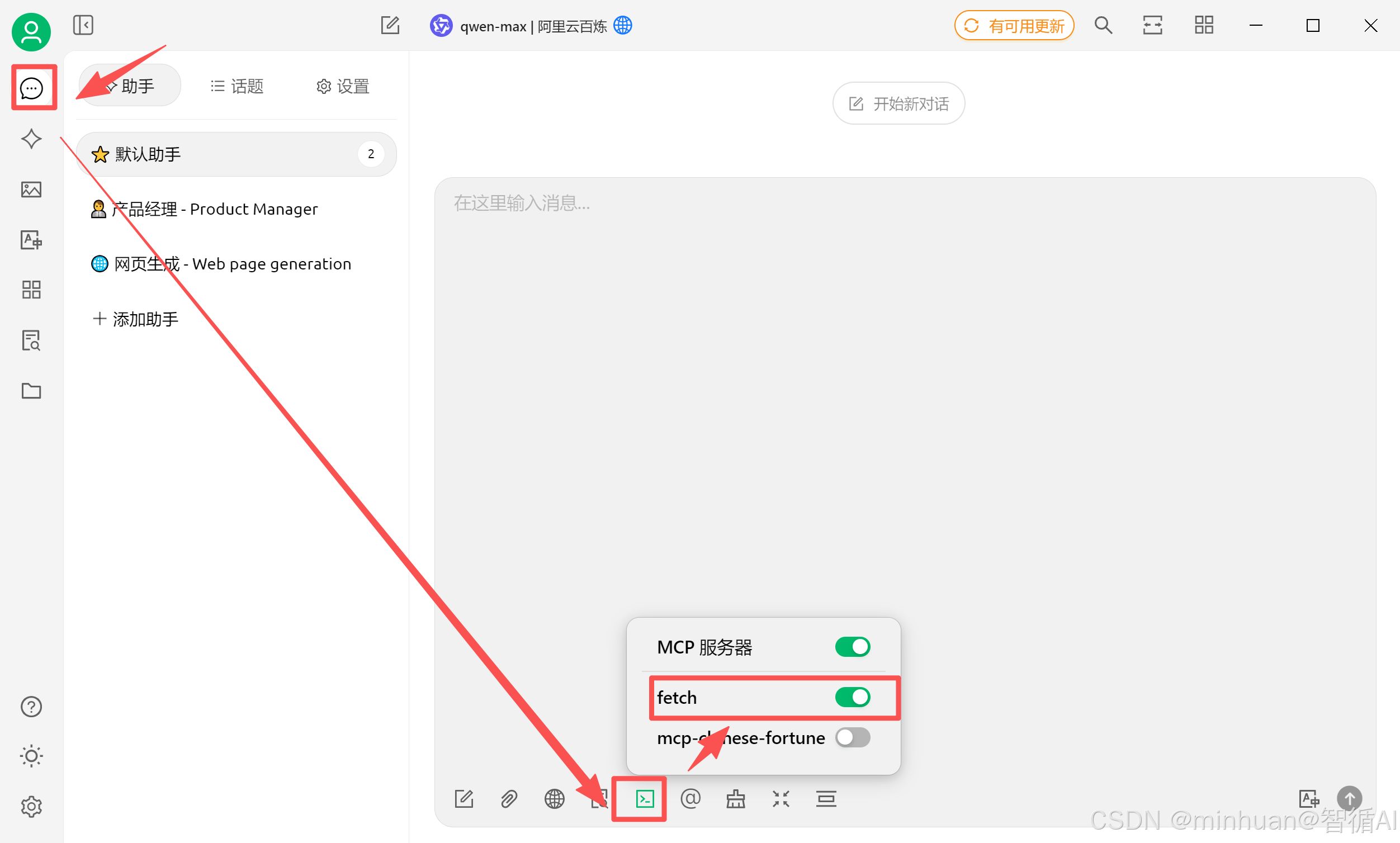 服务配置成功后,可以开始调用了,首先进入聊天【助手】界面,点击下方的【MCP服务器】图标,选择对应的MCP服务开启选中即可。
