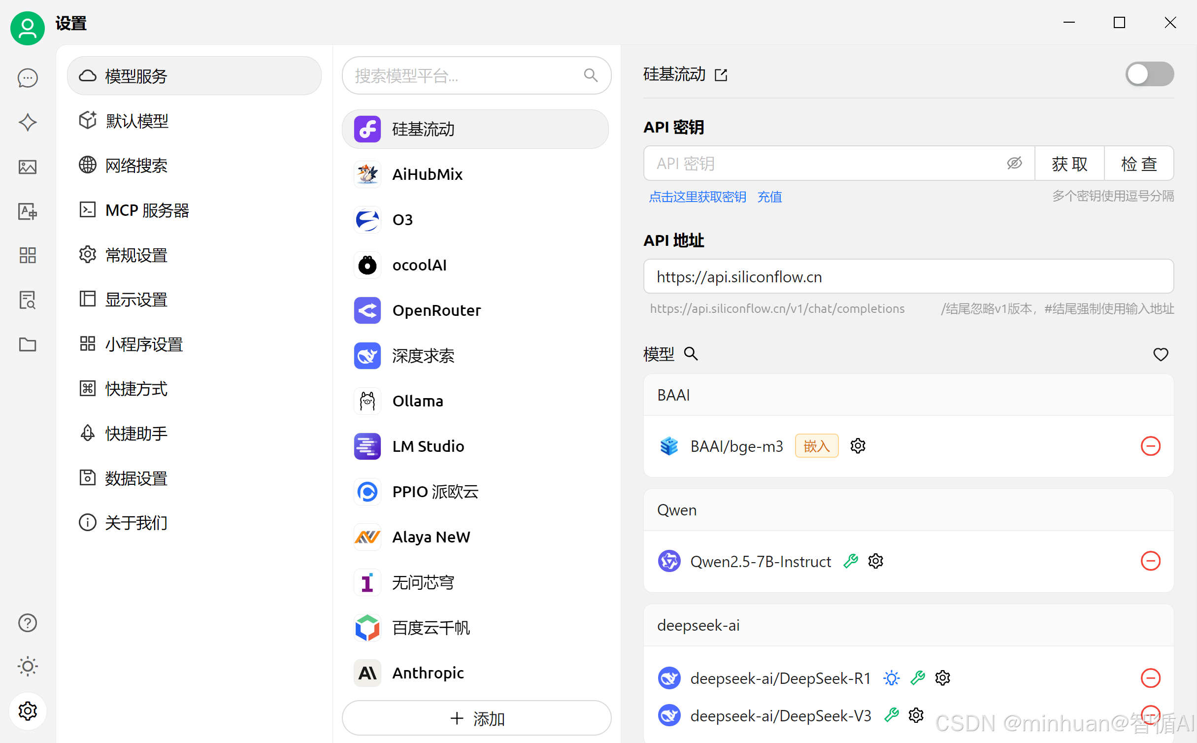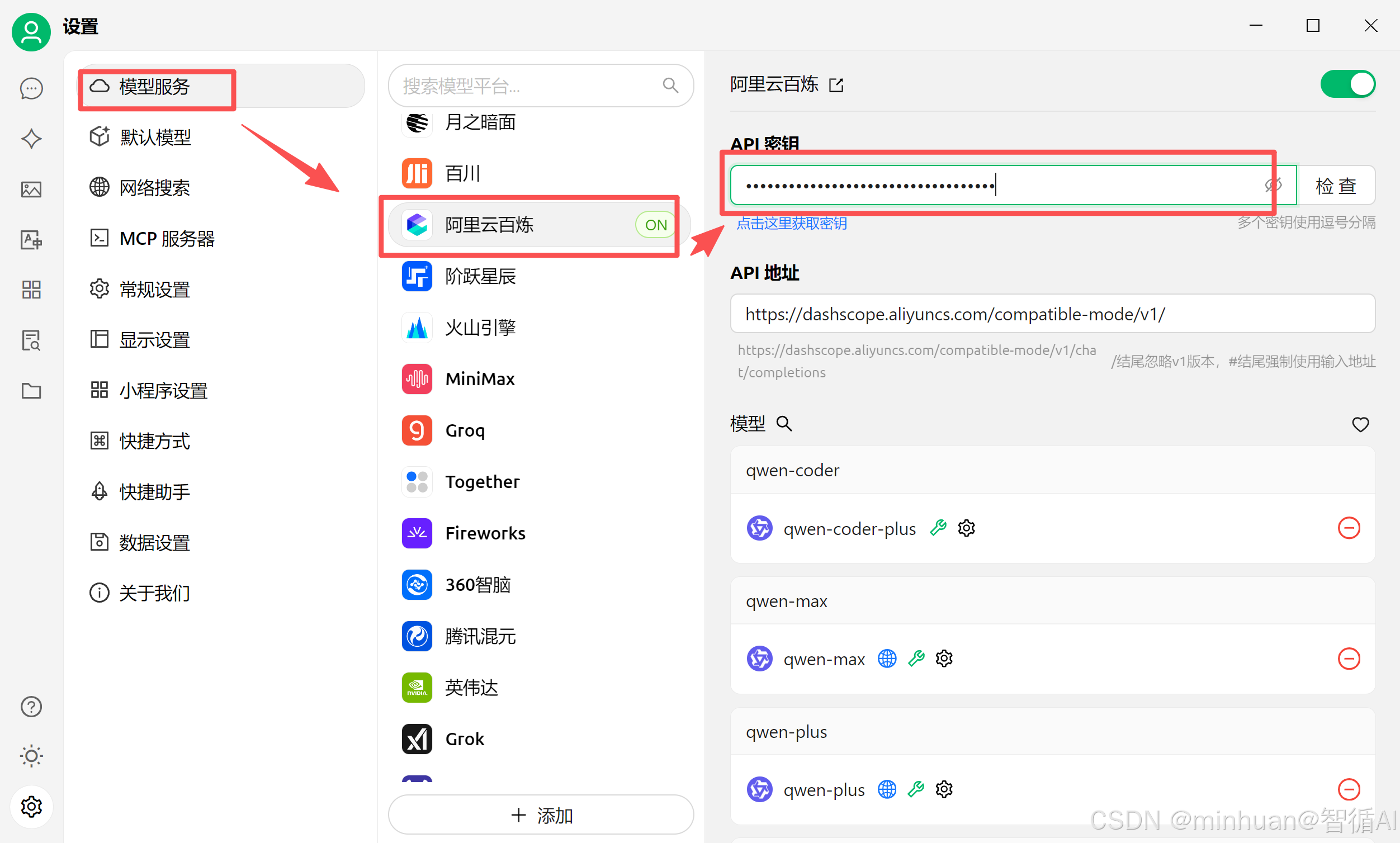 MCP调用也涉及到和模型的交互,也需要配置模型进行后续任务操作,可以配置ollama配置的本地模型,也可以配置现在比较流行的阿里云百炼的qwen系列模型,此处我们以百炼为例,选中【阿里云百炼】后输入API密钥即可,密钥可通过阿里云百炼登录后免费获取,有一定量的免费使用权限可以申请,可相见博文第一篇。