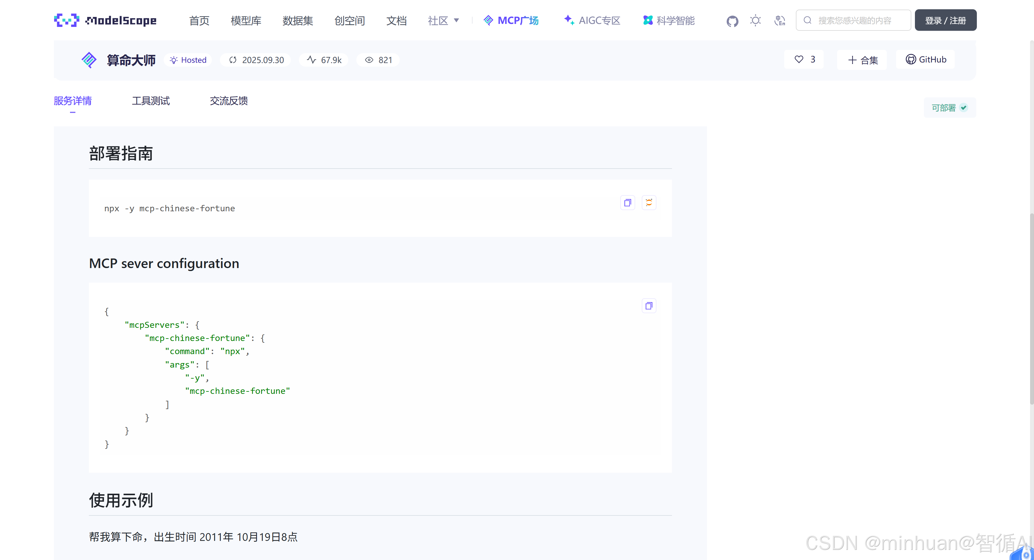 我们再找一个新的MCP服务试试,随机找到一个算命大师:基于模型上下文协议(MCP)的算命大师。 本项目是一个支持公历/农历转换、四柱八字排盘、五行分析、十神推算、运势分析等功能,适用于传统命理应用、算命服务平台、命理类产品。