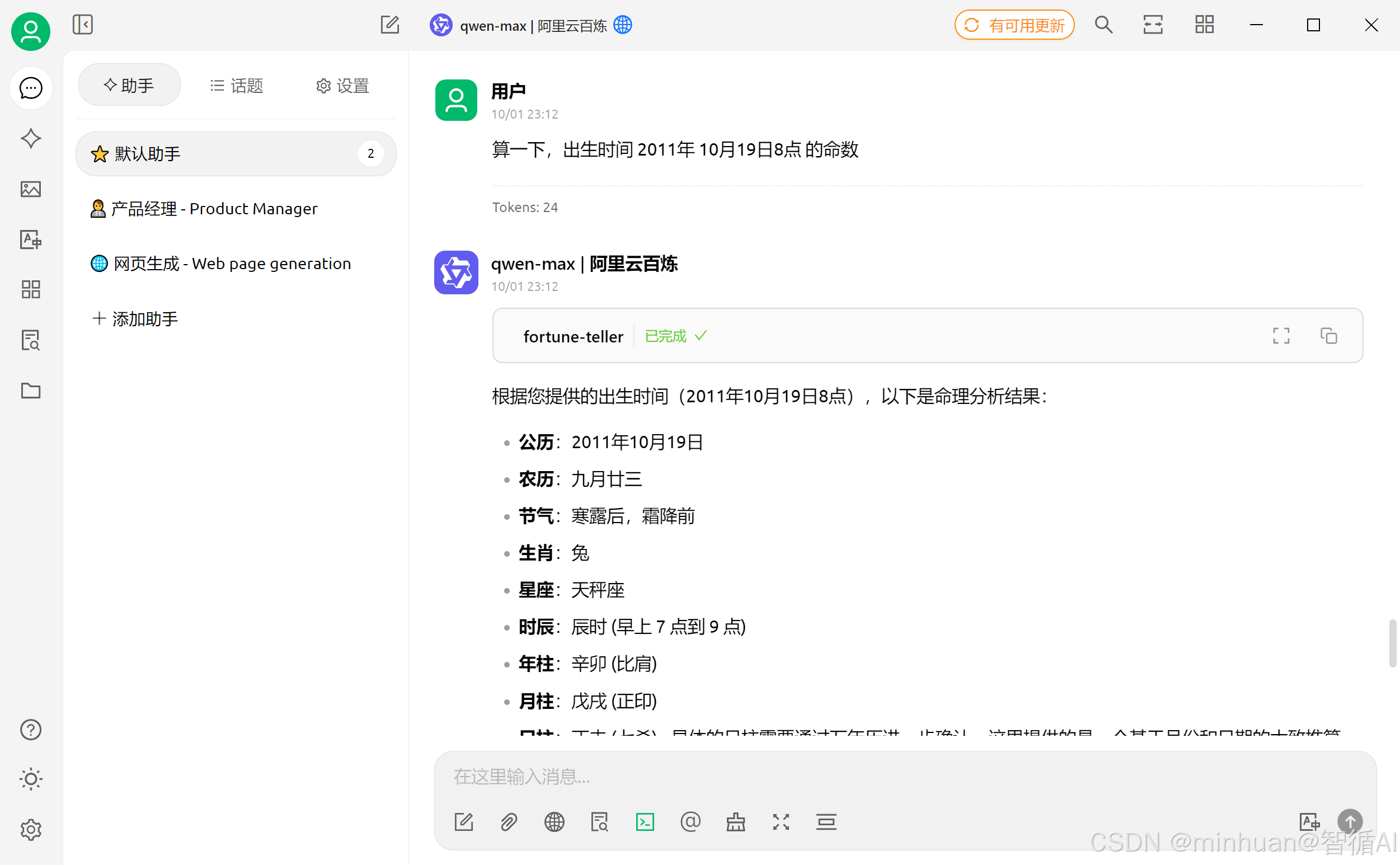 发送聊天“算一下,出生时间 2011年 10月19日8点 的命数”