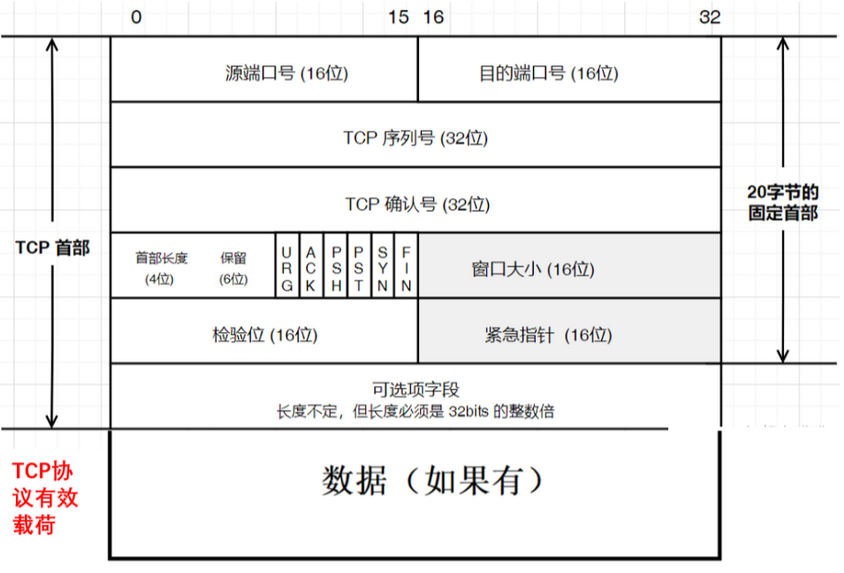 首部长度 (数据偏移) | 指示TCP报文段的头部长度,即数据部分从哪里开始 | 首部长度占4位且单位为4字节,最大可表示的十进制为15,也就是说TCP报文最大为15*4=60字节,而TCP有20字节的固定首部,还有可选字段(如果有) 即TCP报文的有效负载=60-20-可选字段字节 | |
