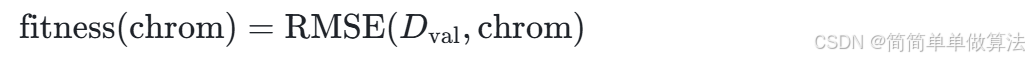适应度函数是遗传算法的“评价标准”,需与模型预测目标一致(如最小化预测误差)。此处以 “LSTM-Attention在验证集Dval上的均方根误差(RMSE)的倒数” 作为适应度值,适应度越高,超参数组合越优。其中定义适应度函数为: