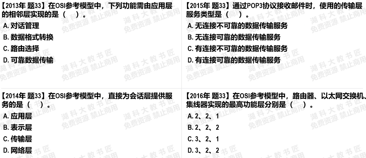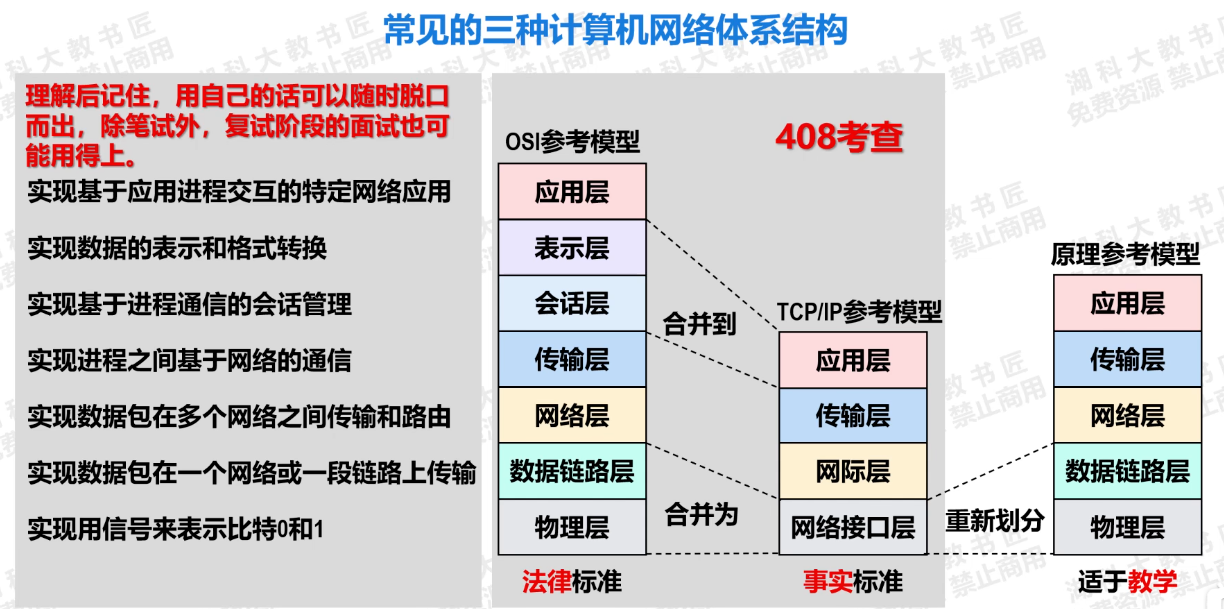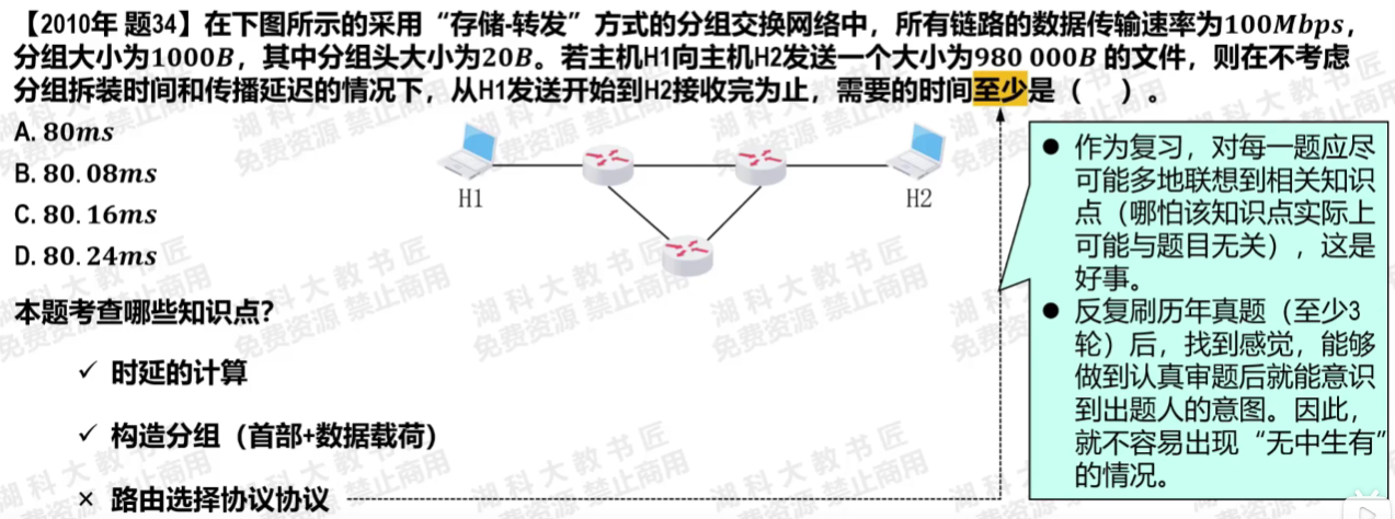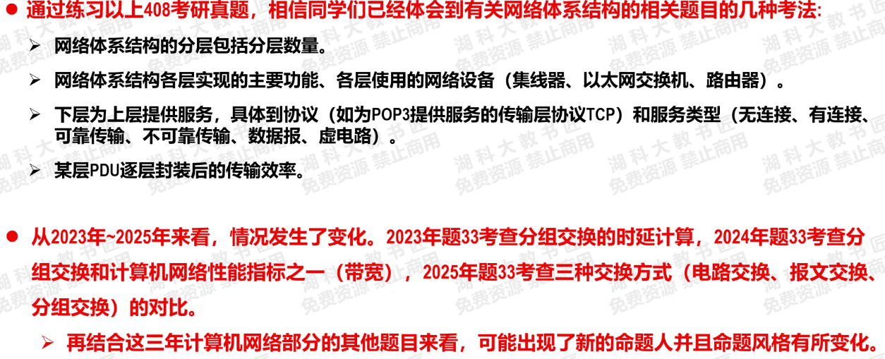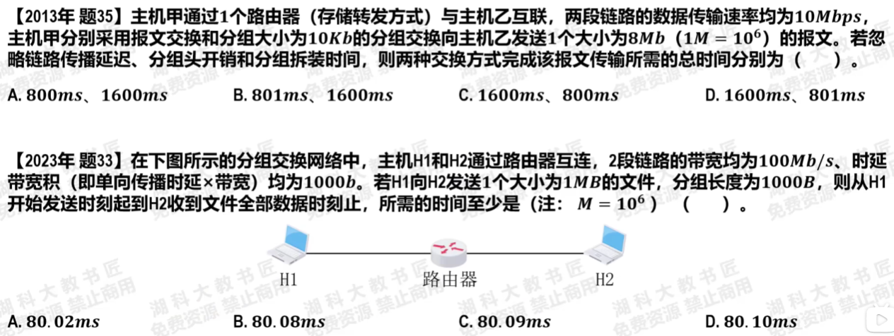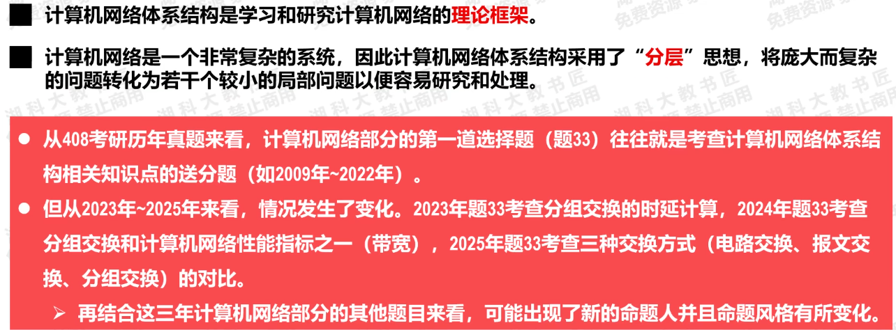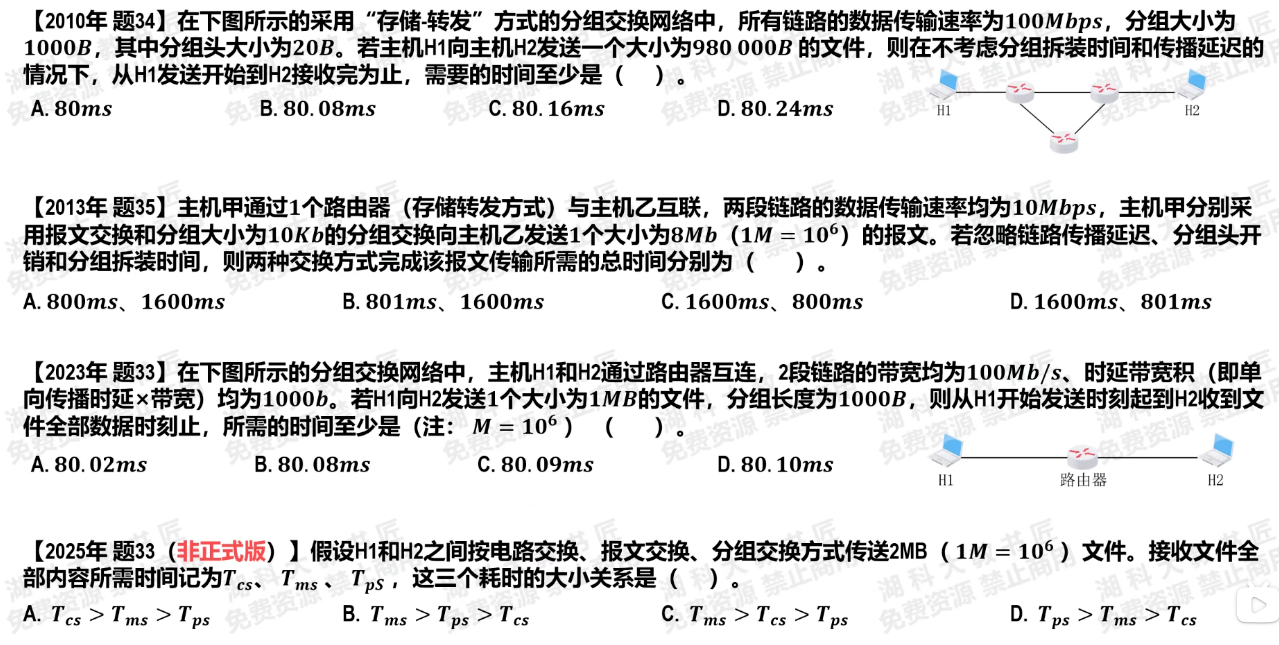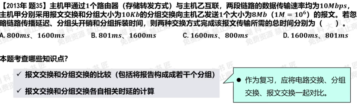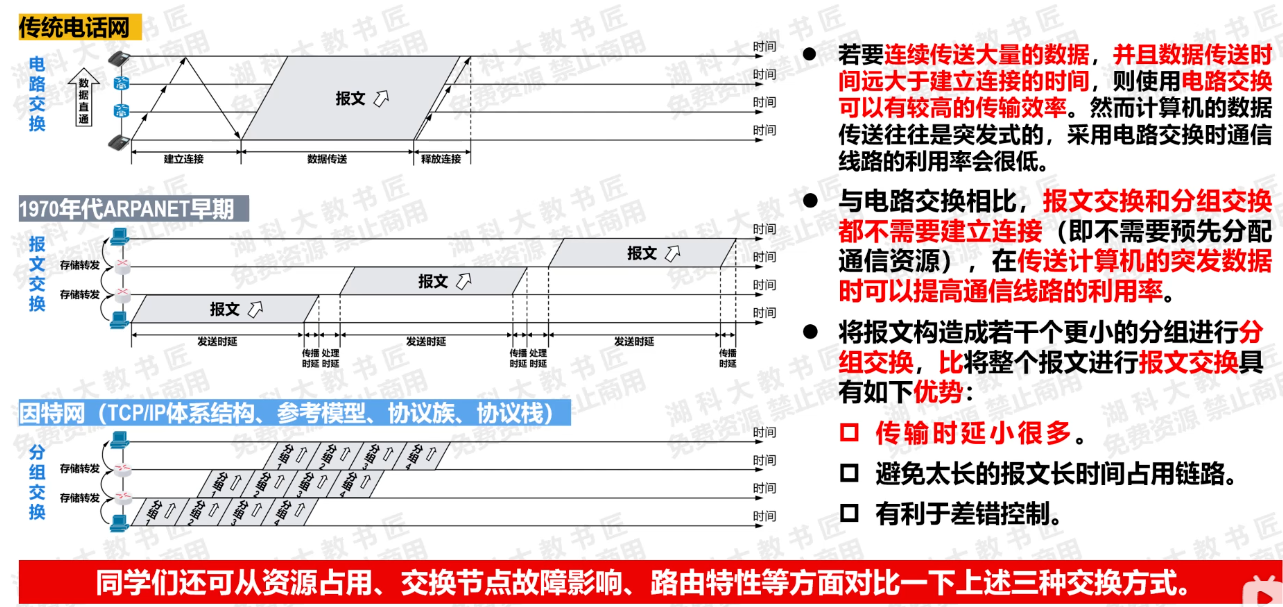 资源占用 | 建立连接时预先独占通信资源,直到连接释放 | 无需预先分配资源,存储转发时动态占用资源 | 无需预先分配资源,分组动态共享资源,占用更灵活(因分组更小、独立性强) |