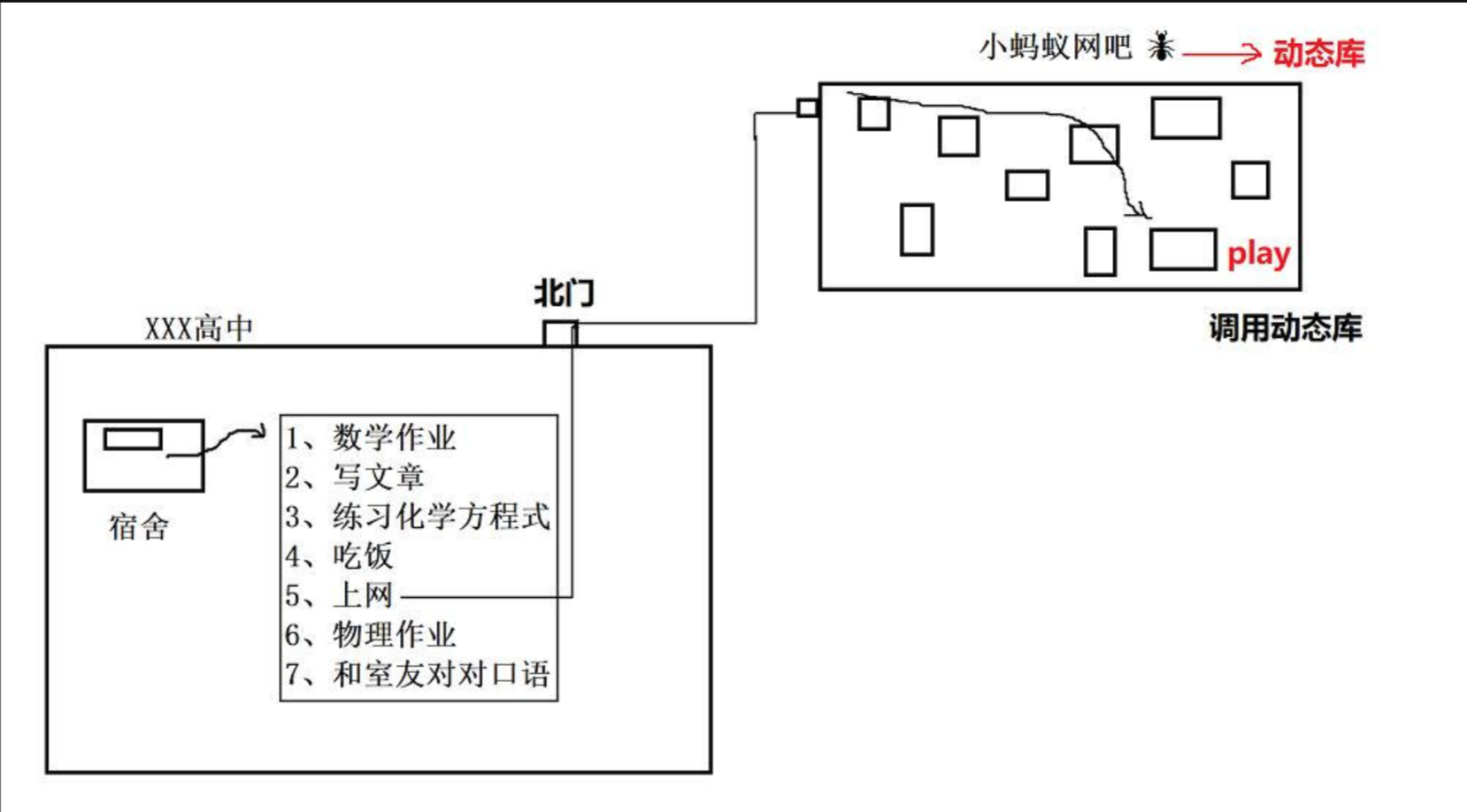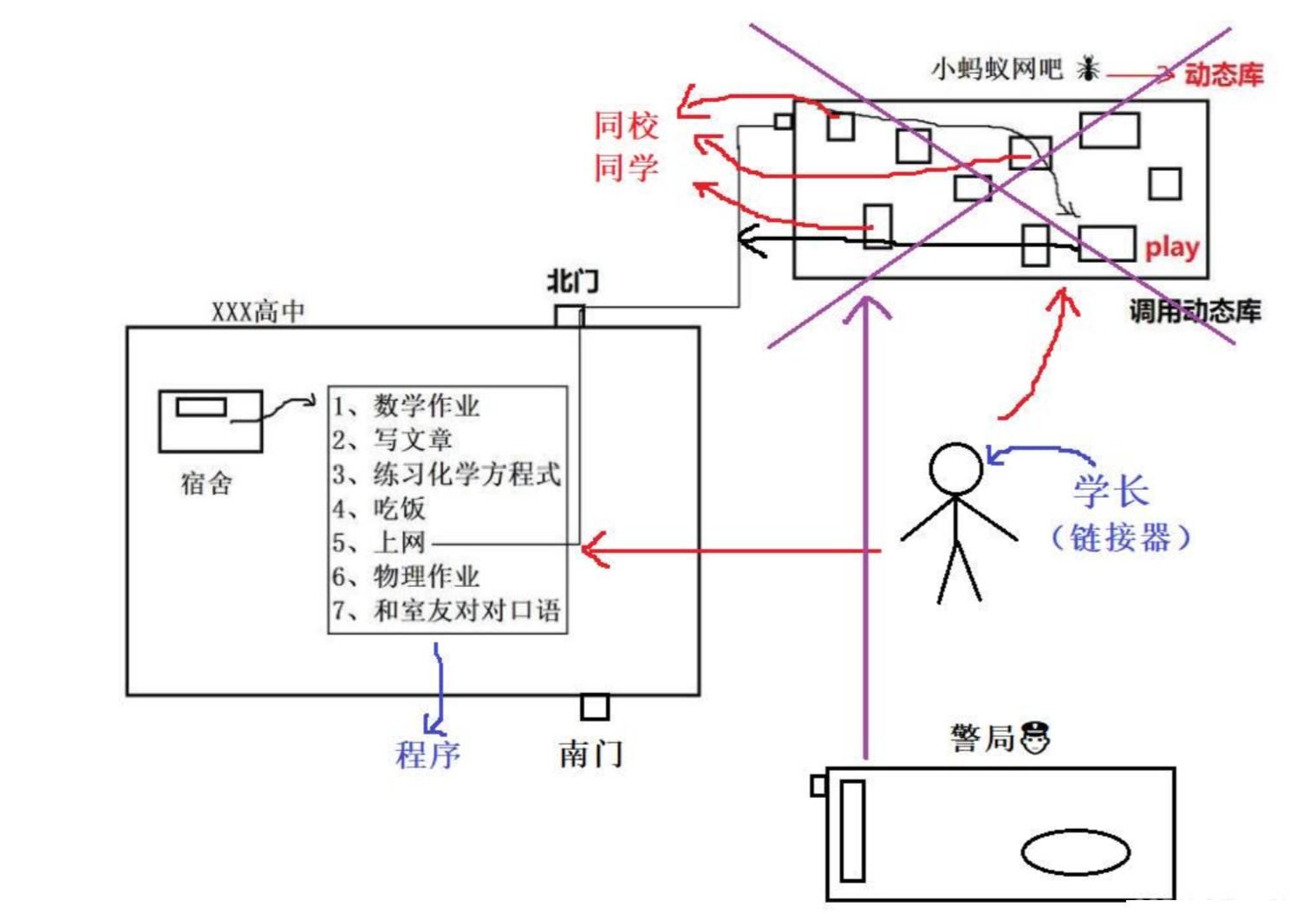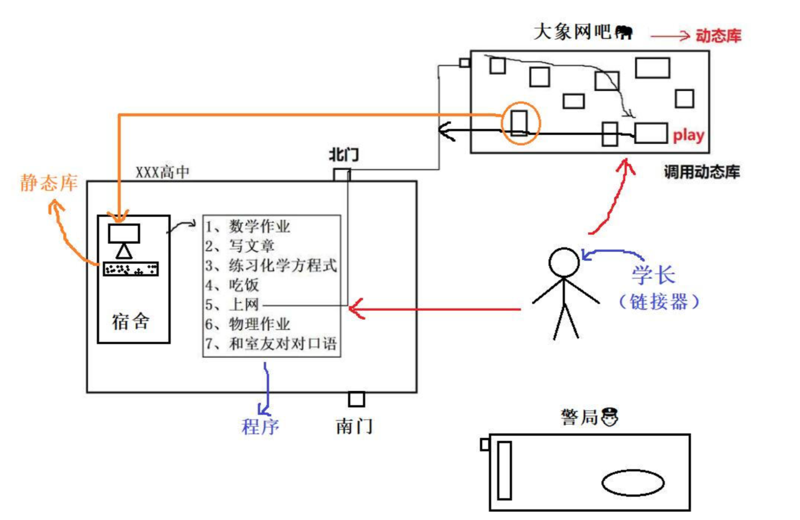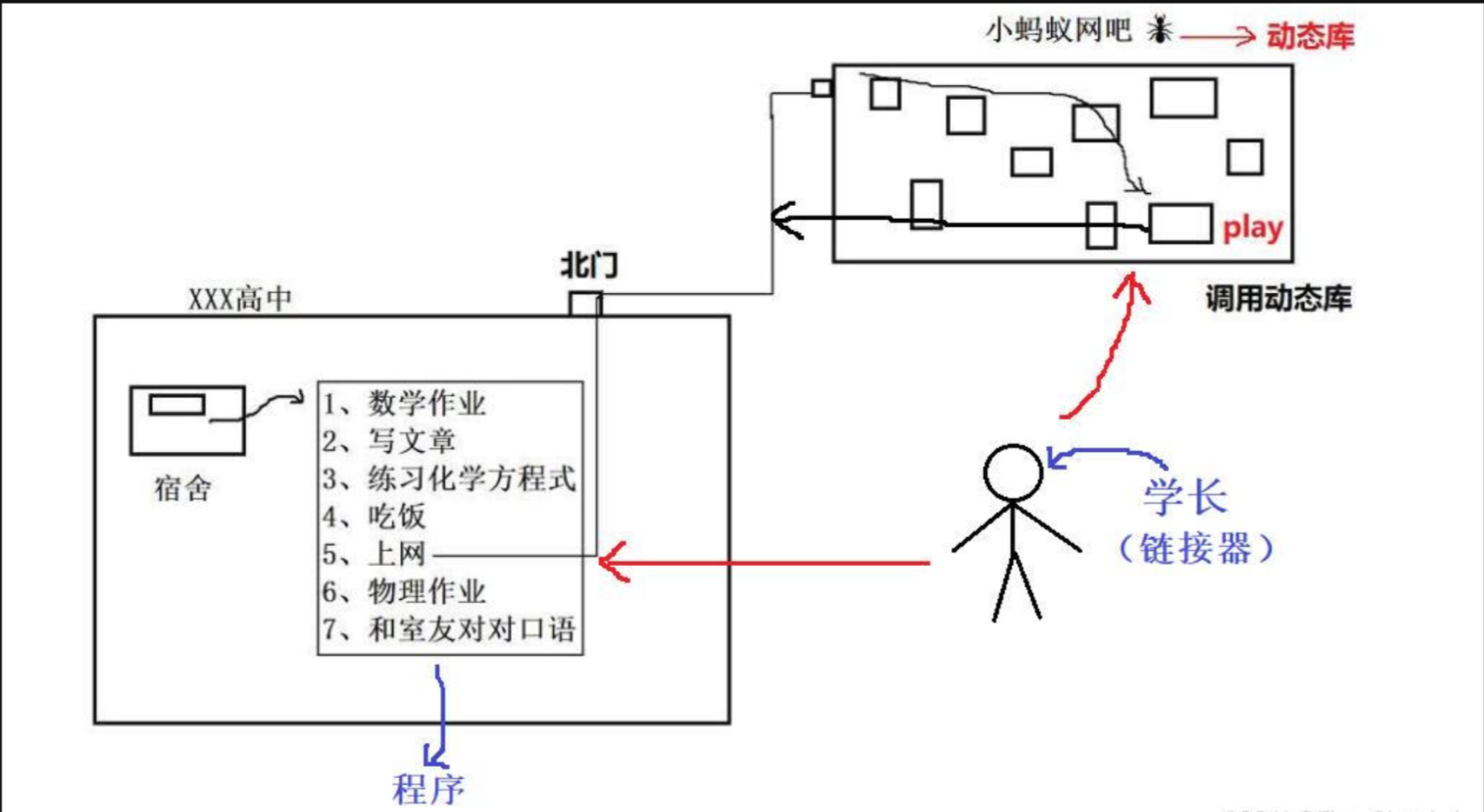 清单(程序)→ 写作业(自定义代码)→ 找学长问地址(链接器找库)→ 去网吧玩游戏(调用动态库)→ 回学校(库调用结束)
