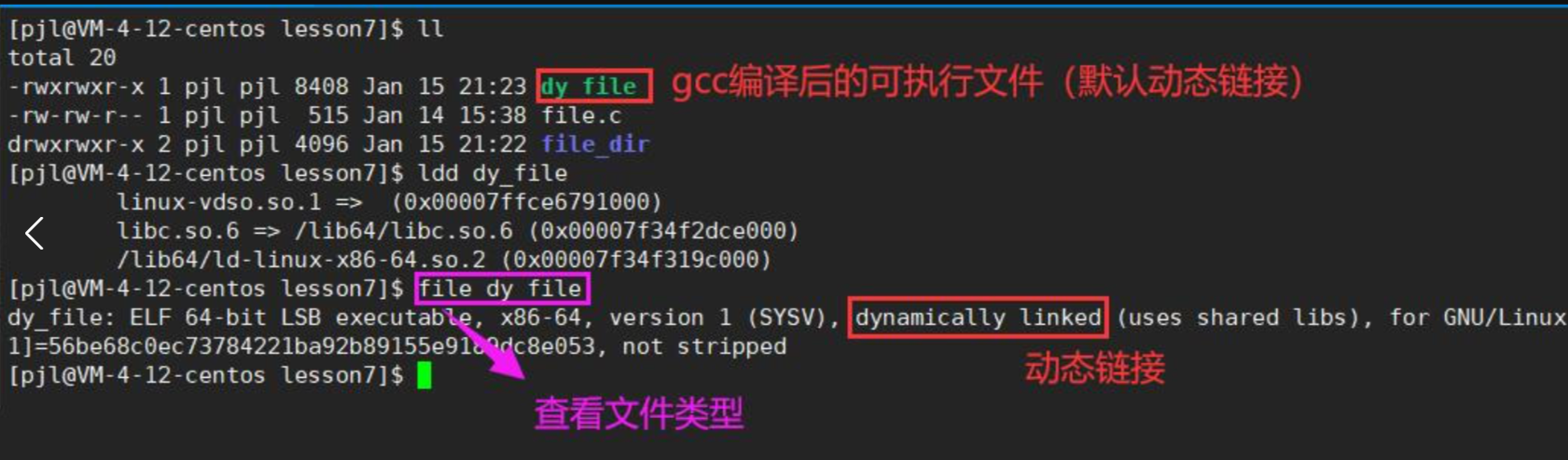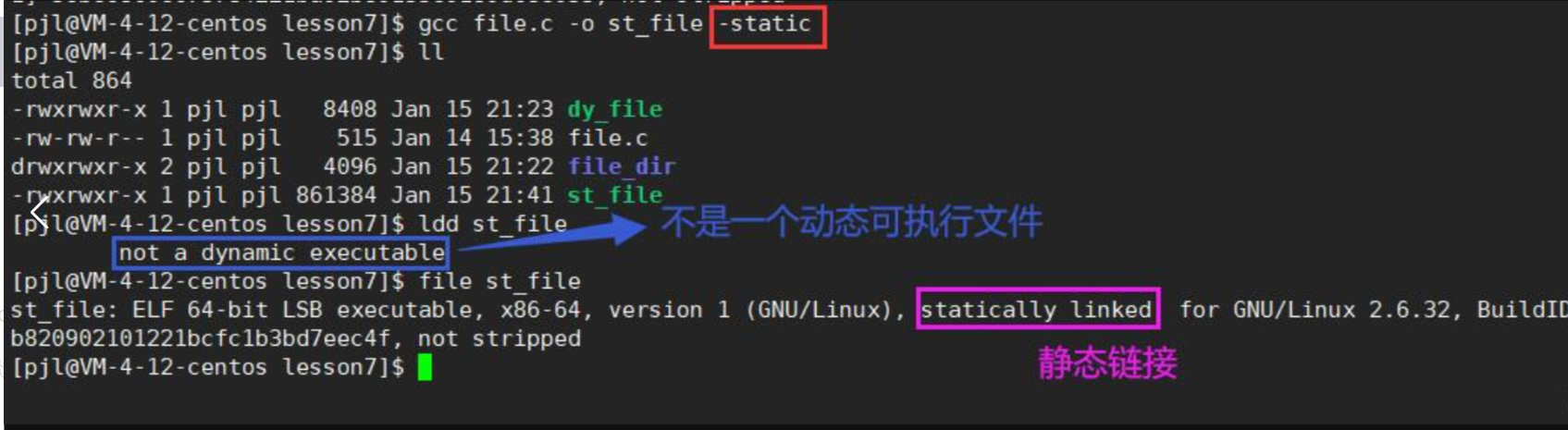 动态的链接,这也就意味着这个可执行文件是经过动态链接生成的(gcc编译完默认是动态链接)- 那我们要如何使一个文件进行静态链接呢,很简单,只需要在使用gcc编译的时候在后面加上一个