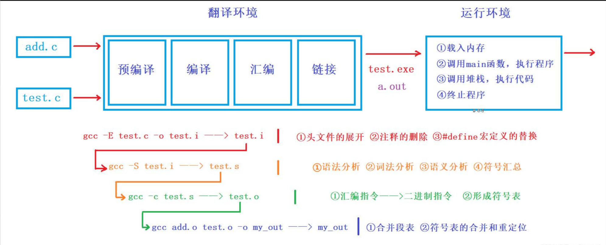 - 然后我们使用gcc针对程序的翻译环境进行了逐步展开分析,看到了一个.c的源文件究竟是怎样一步步变成一个.exe可执行程序的,其中要经过【预编译】【编译】【汇编】【链接】四个步骤