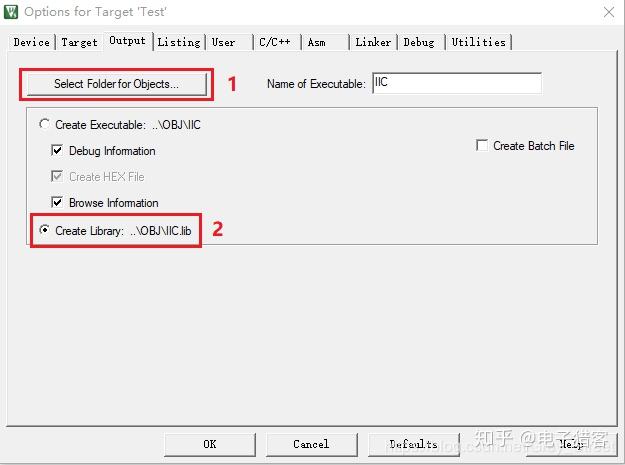4、点击“Output”选项,先点击红框1的“Select Folder for Objects”设置打包的Lib库文件保存位置,途径自己设置就行了,然后勾选红框2的“Create Library”(Create Library后面就是保存的位置),点击OK设置完毕,如下图4: