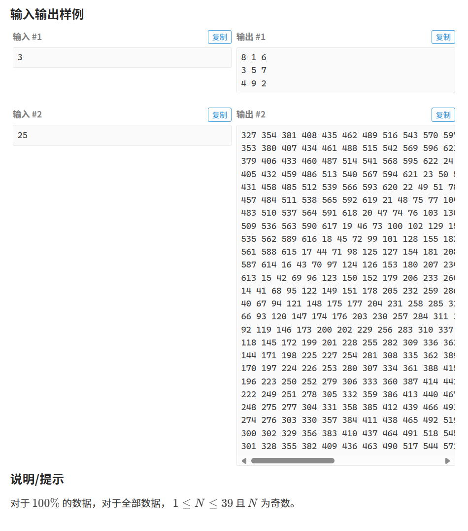import java.util.*;public class Main {public static void main(String[] args) {Scanner sc = new Scanner(System.in);int n = sc.nextInt();int[][] arr = new int[n + 5][n + 5];int i = 0, j = n / 2; // 依据题目数字1在第一行中间arr[i][j] = 1;for (int k = 2; k <= n * n; k++) {if (i == 0 && j == n - 1) { // 在第一行最后一列i++;} else if (i == 0) { // 在第一行i = n - 1;j++;} else if (j == n - 1) { // 在最后一列j = 0;i--;} else { // 不在第一行也不在最后一列if (arr[i - 1][j + 1] == 0) { // 判断右上角是否有填数i--;j++;} else {i++;}}// 经过以上模拟得到当前K所在的行列arr[i][j] = k;}// 输出for (int x = 0; x < n; x++) {for (int y = 0; y < n; y++) {System.out.print(arr[x][y] + " ");}System.out.println();}}