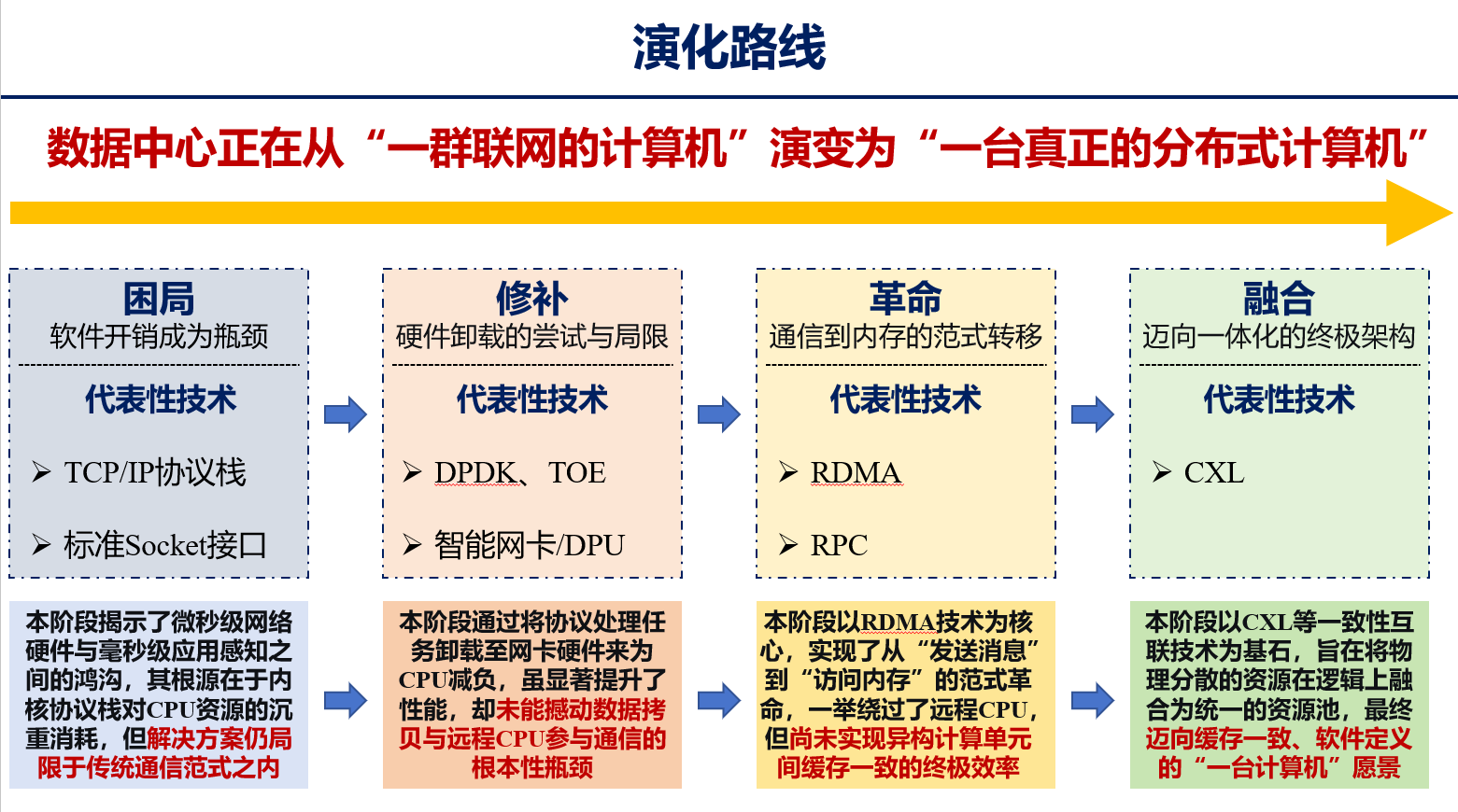 - 革命阶段:RDMA 实现 “从发送消息到访问内存” 的范式转移,绕开远程 CPU,将通信延迟压至微秒级,但留下 “异构缓存不一致”“资源孤岛” 的遗憾;