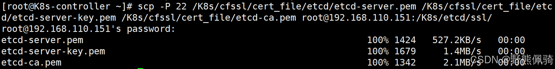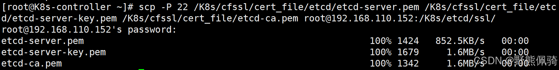 [root@K8s-controller ~]# scp -P 22 /K8s/cfssl/cert_file/etcd/etcd-server.pem /K8s/cfssl/cert_file/etcd/etcd-server-key.pem /K8s/cfssl/cert_file/etcd-ca.pem root@192.168.110.152:/K8s/etcd/ssl/