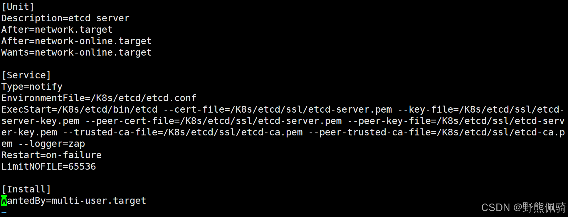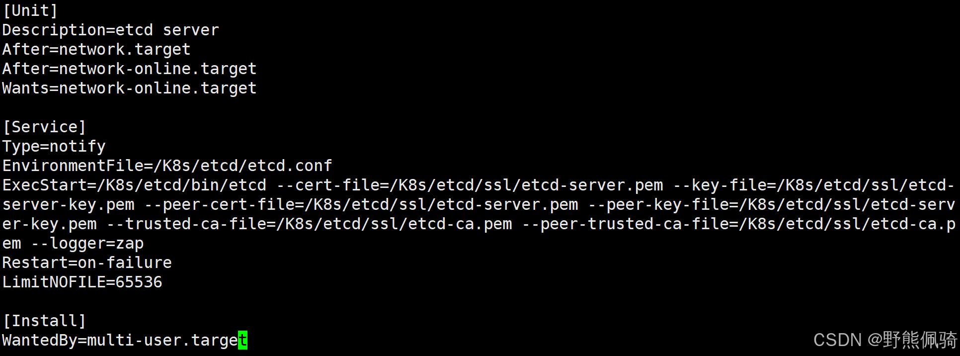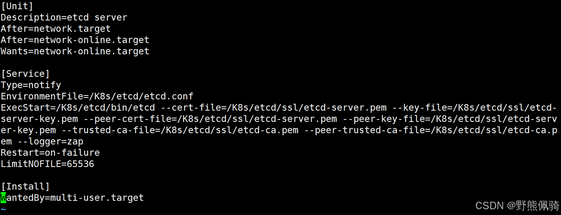 EnvironmentFile=/K8s/etcd/etcd.confExecStart=/K8s/etcd/bin/etcd --cert-file=/K8s/etcd/ssl/etcd-server.pem --key-file=/K8s/etcd/ssl/etcd-server-key.pem --peer-cert-file=/K8s/etcd/ssl/etcd-server.pem --peer-key-file=/K8s/etcd/ssl/etcd-server-key.pem --trusted-ca-file=/K8s/etcd/ssl/etcd-ca.pem --peer-trusted-ca-file=/K8s/etcd/ssl/etcd-ca.pem --logger=zap