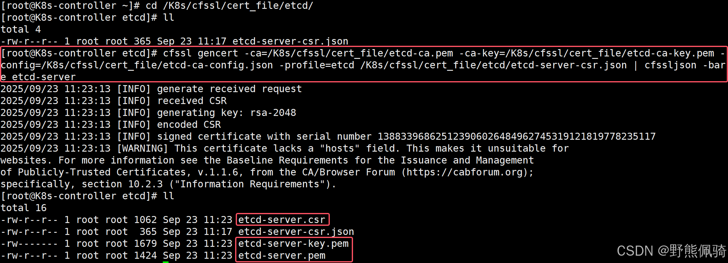[root@K8s-controller etcd]# cfssl gencert -ca=/K8s/cfssl/cert_file/etcd-ca.pem -ca-key=/K8s/cfssl/cert_file/etcd-ca-key.pem -config=/K8s/cfssl/cert_file/etcd-ca-config.json -profile=etcd /K8s/cfssl/cert_file/etcd/etcd-server-csr.json | cfssljson -bare etcd-server