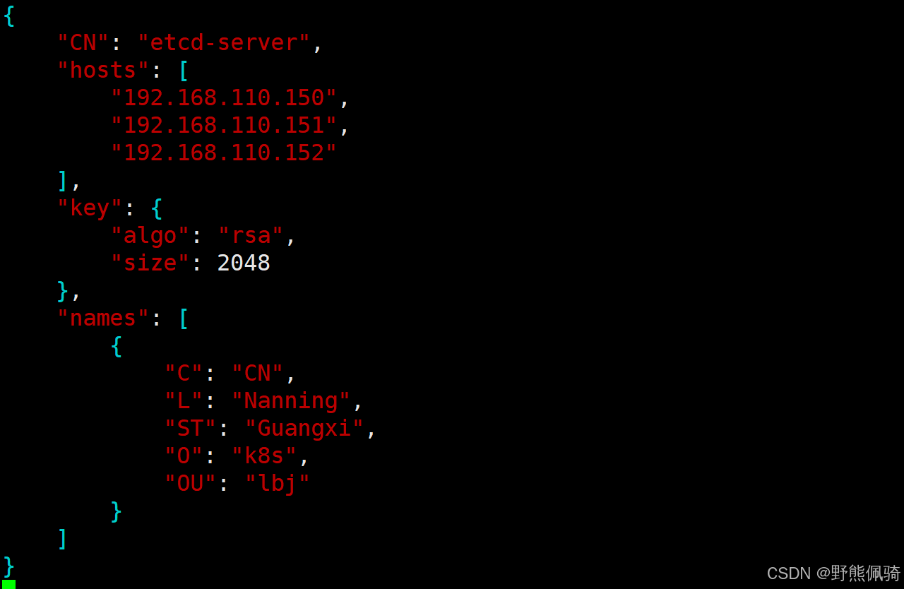- 创建etcd集群服务证书签名请求文件etcd-csr.json