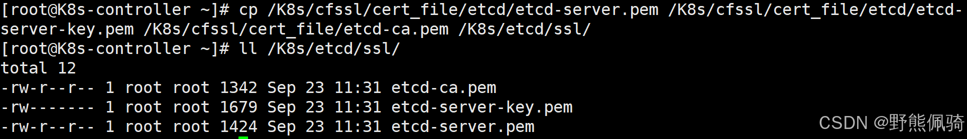 [root@K8s-controller ~]# cp /K8s/cfssl/cert_file/etcd/etcd-server.pem /K8s/cfssl/cert_file/etcd/etcd-server-key.pem /K8s/cfssl/cert_file/etcd-ca.pem /K8s/etcd/ssl/