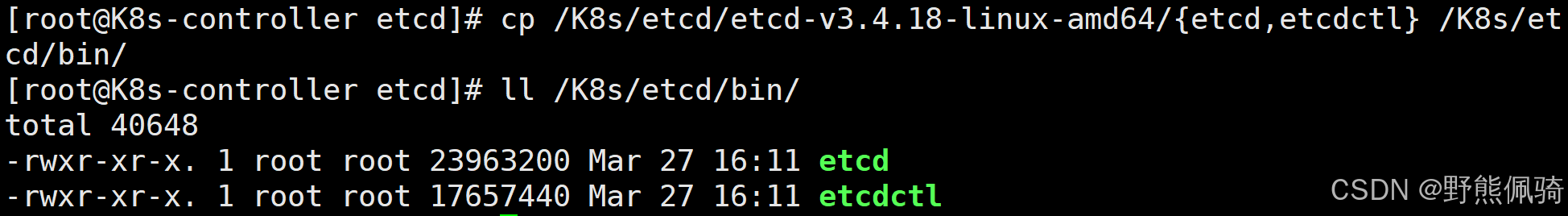 [root@K8s-controller etcd]# cp /K8s/etcd/etcd-v3.4.18-linux-amd64/{etcd,etcdctl} /K8s/etcd/bin/