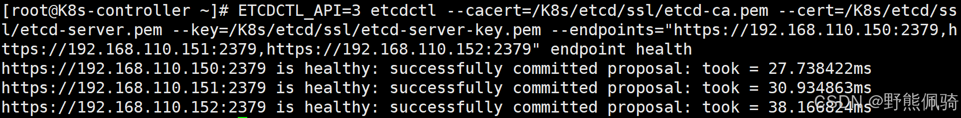 [root@K8s-controller ~]# ETCDCTL_API=3 etcdctl --cacert=/K8s/etcd/ssl/etcd-ca.pem --cert=/K8s/etcd/ssl/etcd-server.pem --key=/K8s/etcd/ssl/etcd-server-key.pem --endpoints="https://192.168.110.150:2379,https://192.168.110.151:2379,https://192.168.110.152:2379" endpoint health