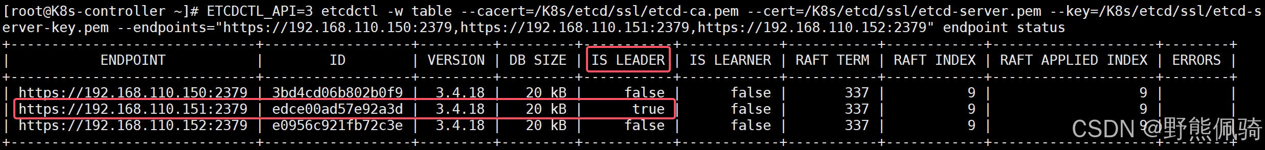 由上可见,192.168.110.151节点(K8s-controller)为LEADER节点