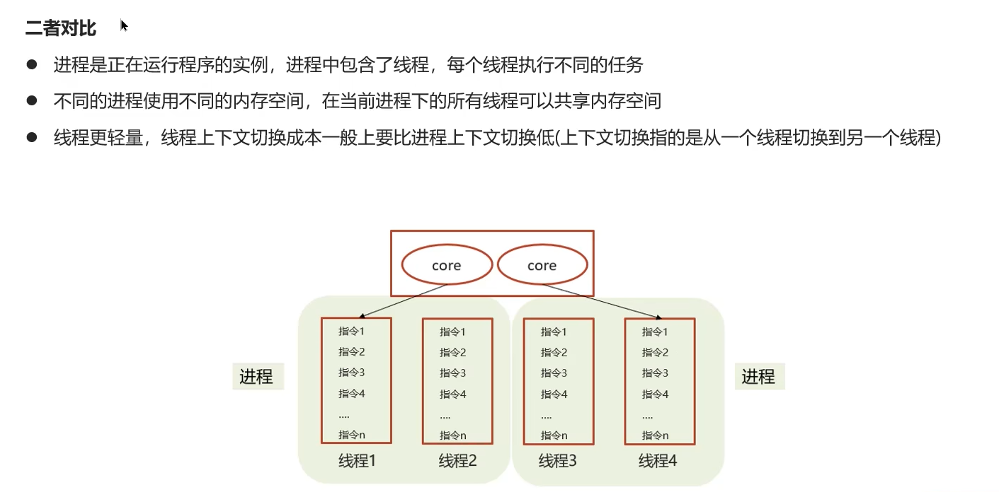 资源开销 | 大(独立地址空间,创建、销毁、切换开销大) | 小(共享地址空间,创建、销毁、切换开销小) |