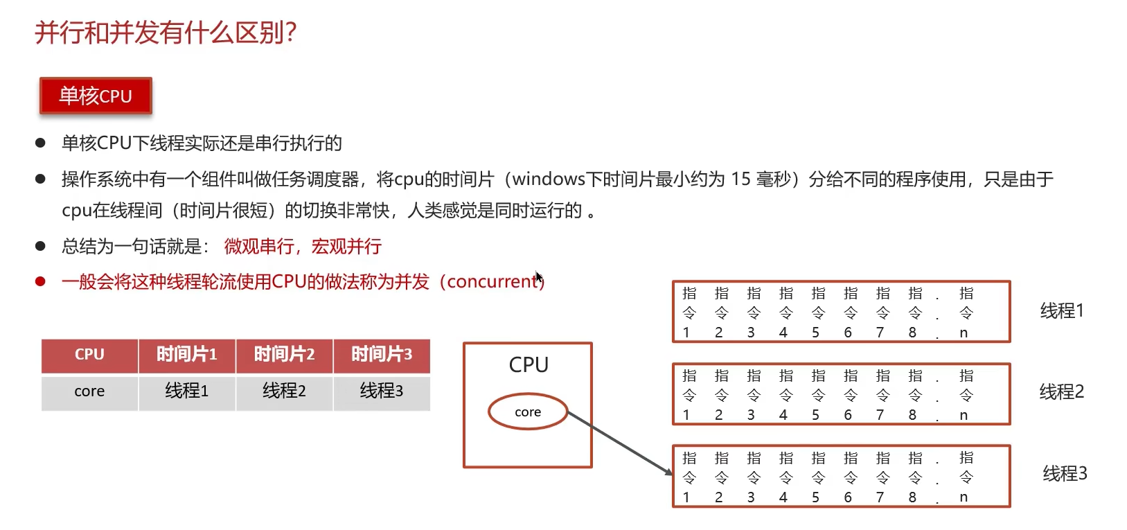 并行: 物理上的同时执行。指在多核CPU上,多个任务在同一时刻真正地同时执行。它需要硬件支持,是并发的真子集。
