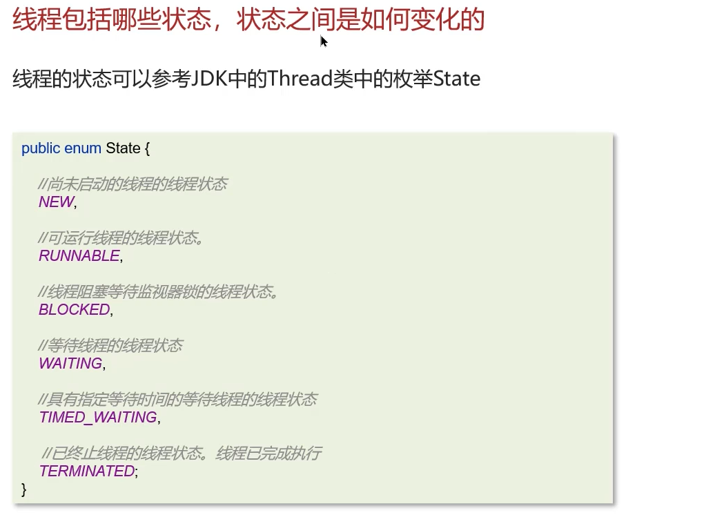 WAITING --notify()/notifyAll()/目标线程结束--> RUNNABLERUNNING --sleep(time)/wait(time)--> TIMED_WAITING