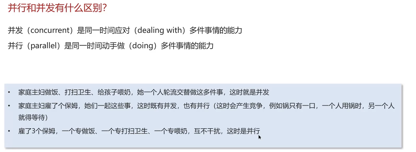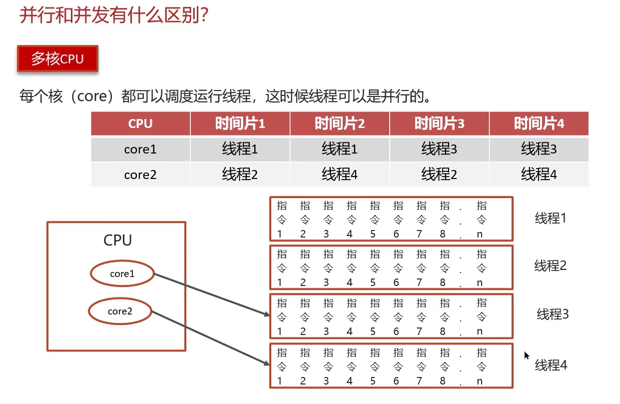 - 例子: 四核CPU,一个核心在计算Excel公式,一个核心在播放音乐,一个核心在渲染网页,它们是真正同时进行的。