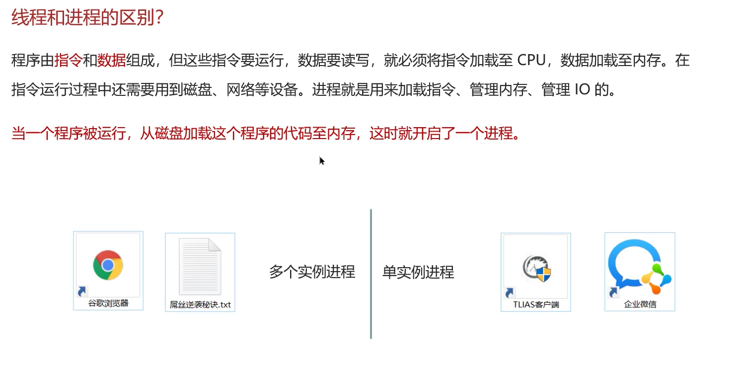 - 例子: 单核CPU同时运行微信和Chrome浏览器。CPU先执行一段微信的代码,再快速切换到执行一段Chrome的代码,用户感觉两个程序在“同时”运行。