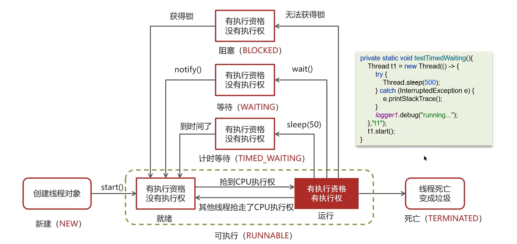 TIMED_WAITING --时间到--> RUNNABLERUNNING --run()方法结束/异常退出--> TERMINATED