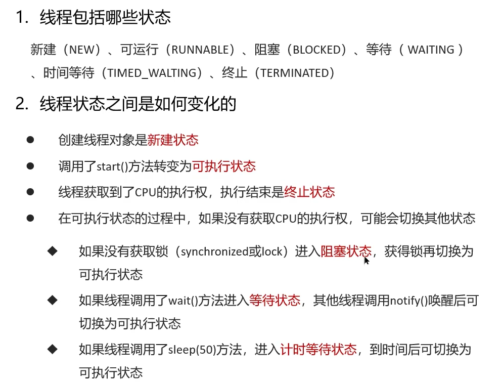 后。注意:此状态包含了 正在CPU上运行(Running) 和 就绪(Ready,在等待CPU时间片) 两种子状态。 - BLOCKED(阻塞):线程等待获取一个监视器锁(synchronized锁) 而陷入阻塞。(其他线程释放锁后,JVM会随机选择一个此状态的线程变为RUNNABLE)