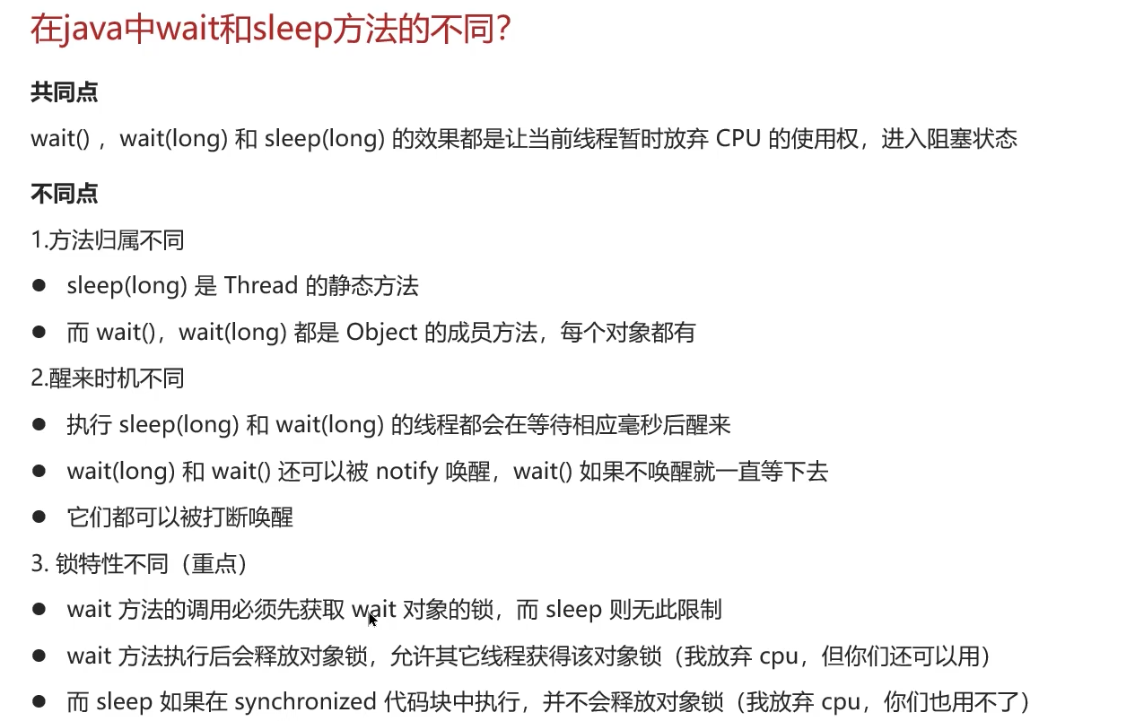 作用机制 | 释放当前持有的对象锁 | 不释放任何锁(包括synchronized和Lock) |