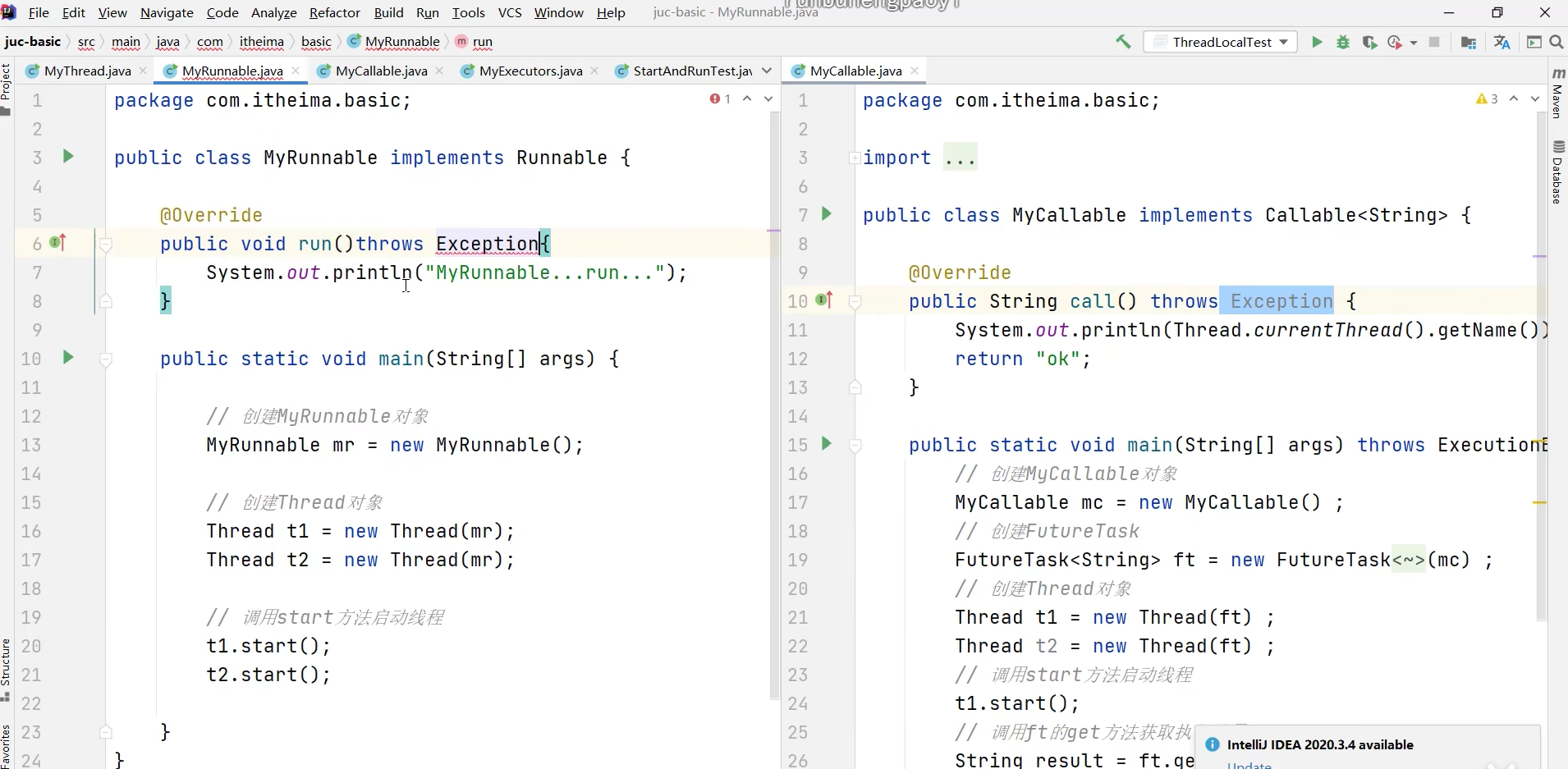 三、线程创建的方式:Runnable vs. Callable,start vs. run