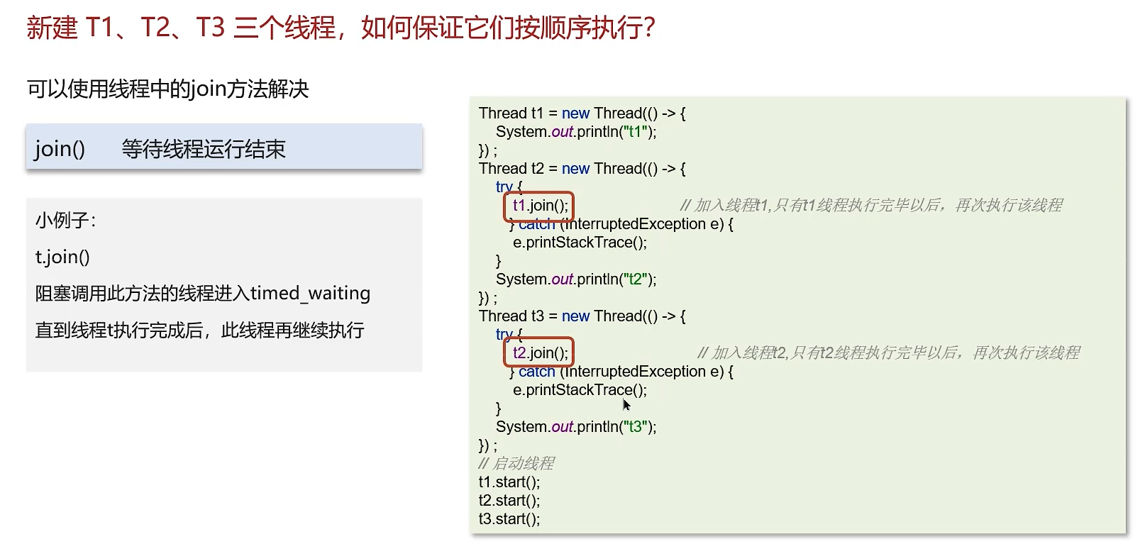 Thread t2 = new Thread(() -> {try {t1.join(); // 等T1执行完} catch (InterruptedException e) {e.printStackTrace();}System.out.println("T2");