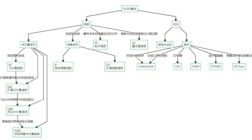 概率分布,通过机器人的运动模型和观测信息,利用统计手段逐步减少估计值与真实值的偏差,从而完成机器人在环境运动过程中的位姿和路标的估计,按求解的方式不同可以分为滤波和优化: