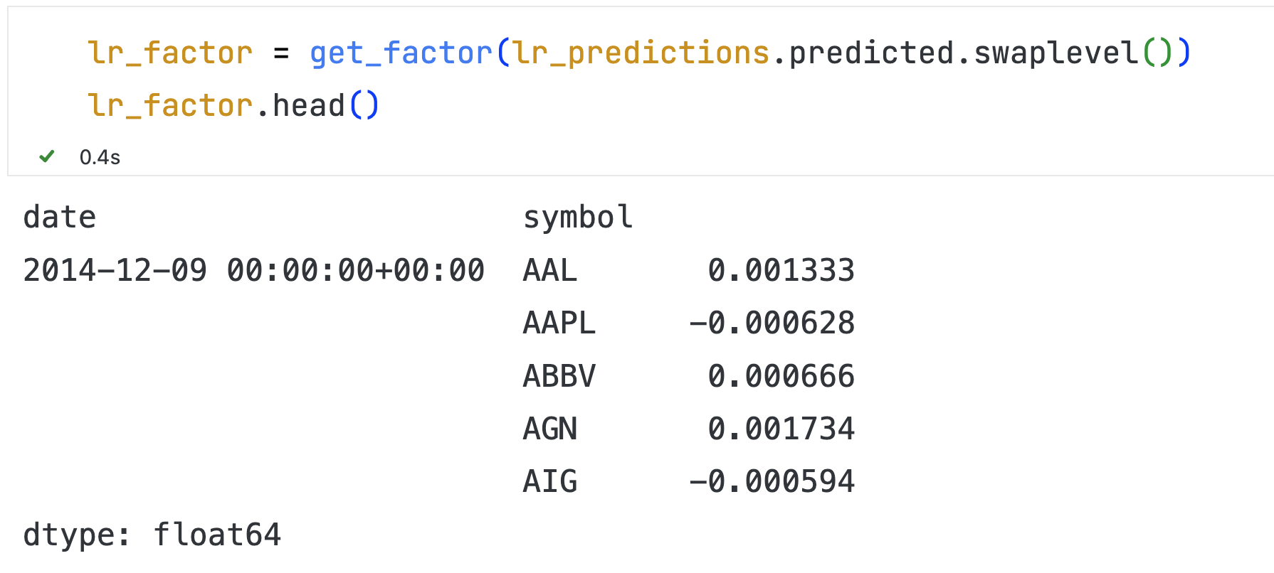 from alphalens.utils import get_clean_factor_and_forward_returnsidx = pd.IndexSlicewith pd.HDFStore('data.h5') as store:lr_predictions = store['lr/predictions']lasso_predictions = store['lasso/predictions']lasso_scores = store['lasso/scores']ridge_predictions = store['ridge/predictions']ridge_scores = store['ridge/scores']# DATA_STORE = Path('..', 'data', 'assets.h5')